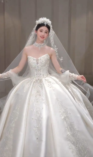 Niulatu Ball Gown Strapless Satin Applique Beaded With Veil Long Wedding Dresses HZ1110