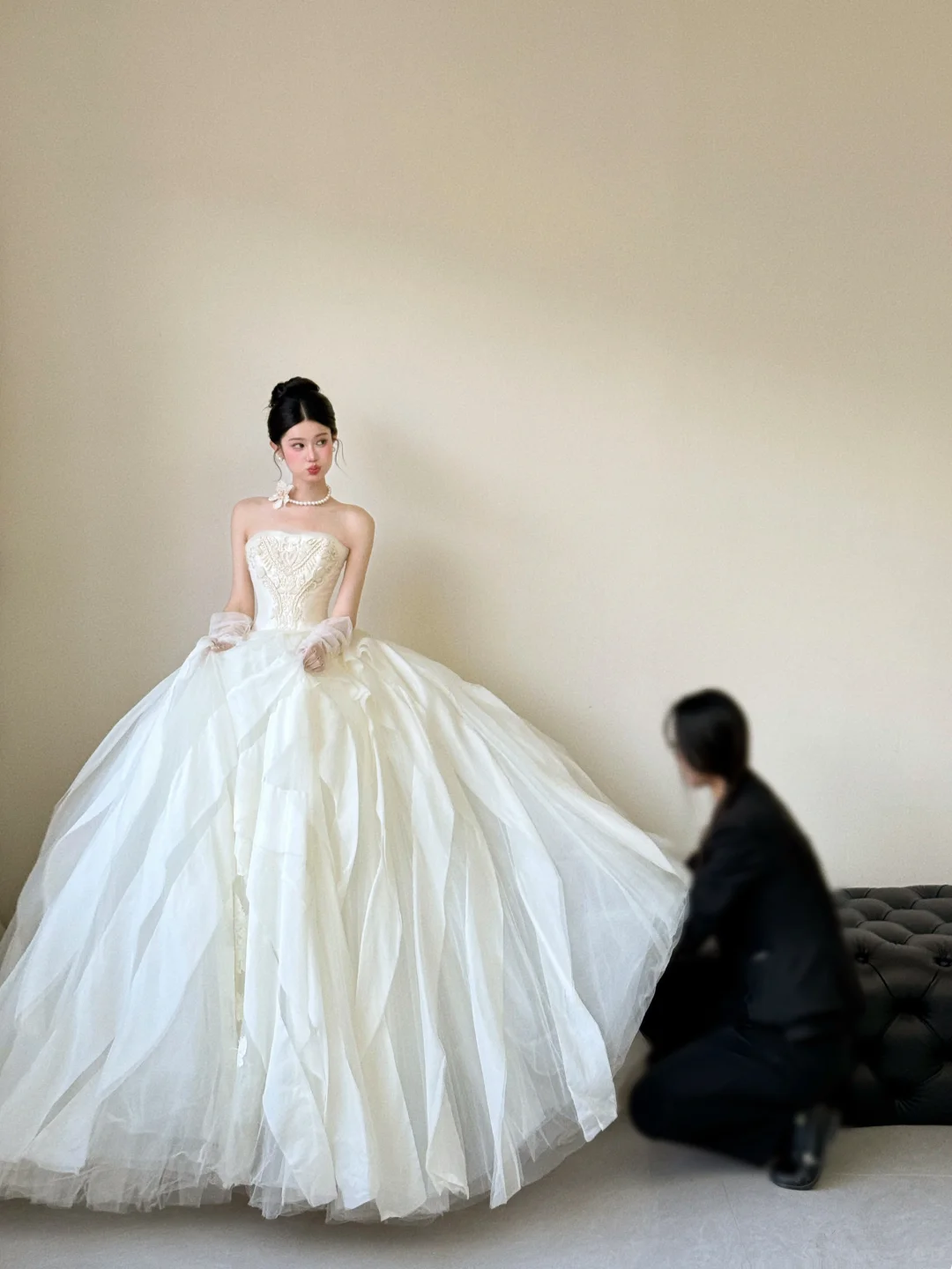 Niulatu Ball Gown Strapless White Satin Tulle Applique With Gloves Long Wedding Dresses HZ1110