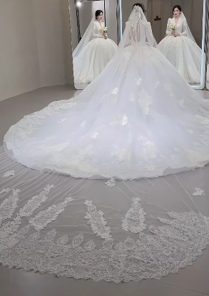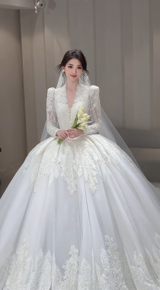 Niulatu Ball Gown V Neck Tulle Lace Long Sleeves With Train Long Wedding Dresses HZ1110