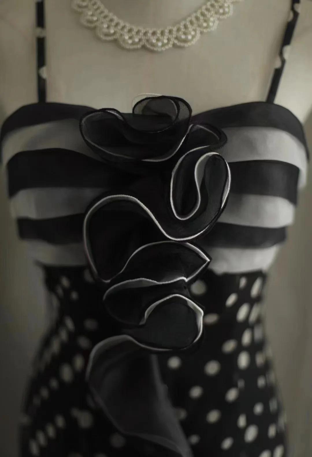 Niulatu Black Spaghetti Strap Chiffon Long Prom Skirt Polka Dot Evening Dress HZ1103