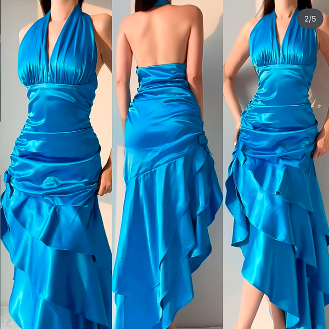 Niulatu Blue Halter Neck Sheath Layered Satin Prom Dresses Vintage Evening Gowns HZ1031