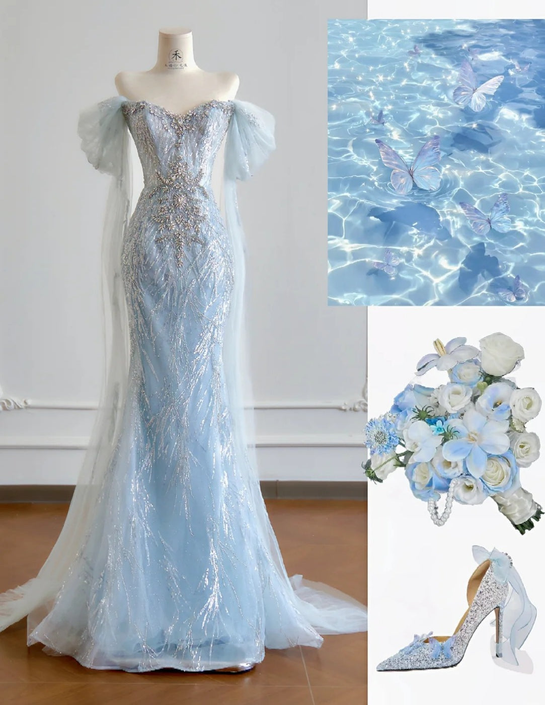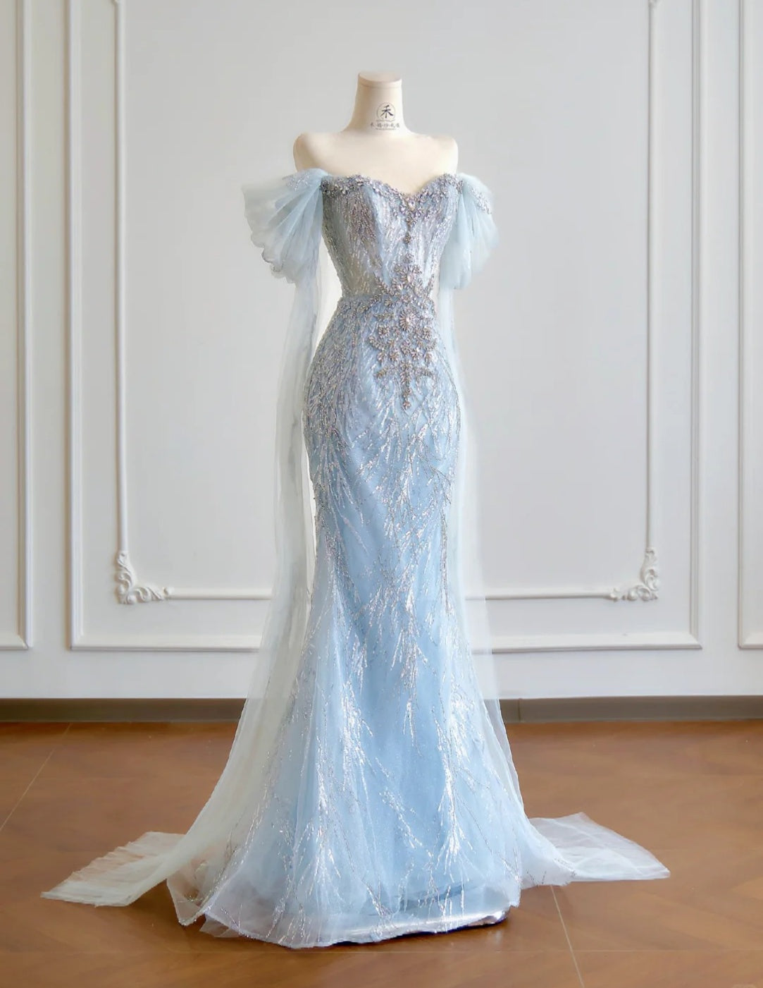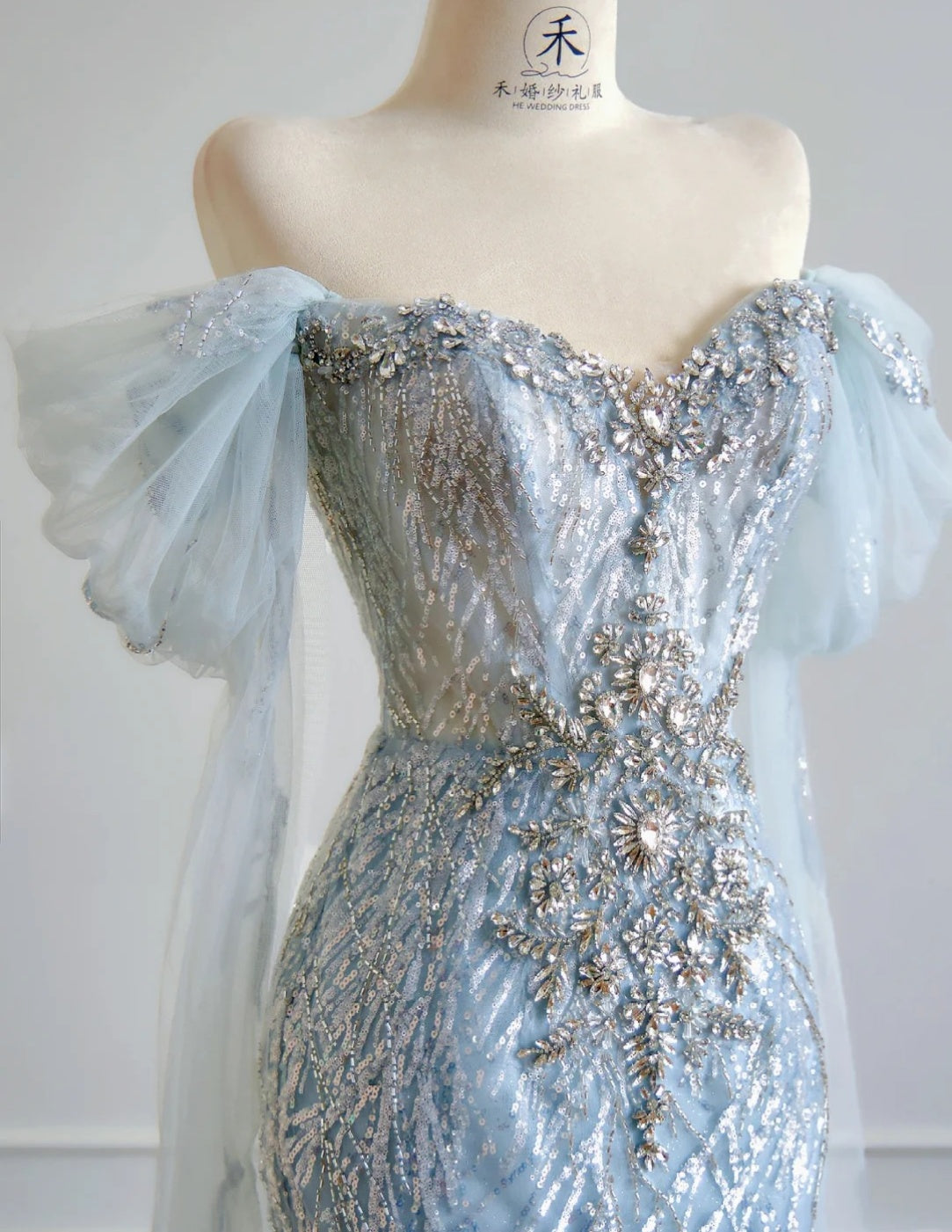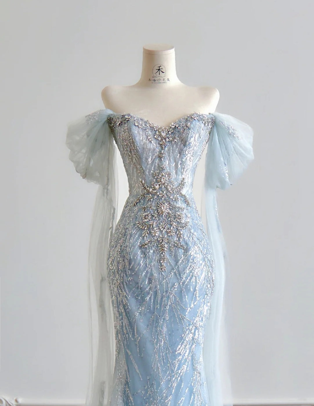 Niulatu Blue Mermaid Wedding Dress Tulle Off-the-Shoulder Beaded Sequin Evening Dress HZ1031