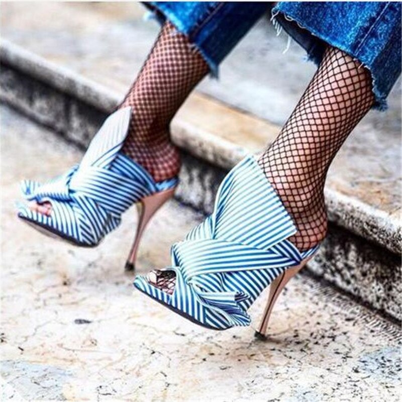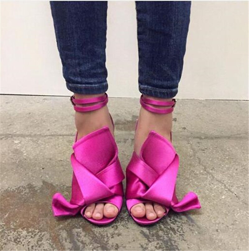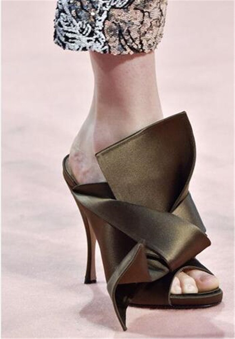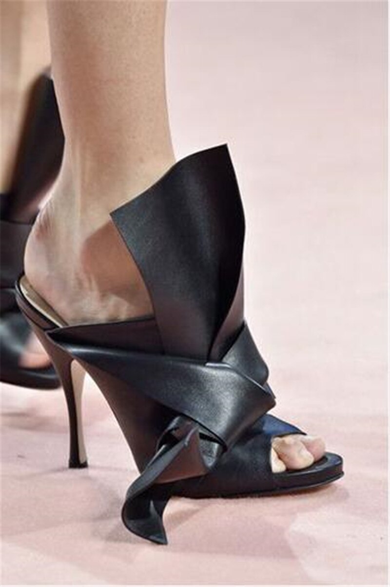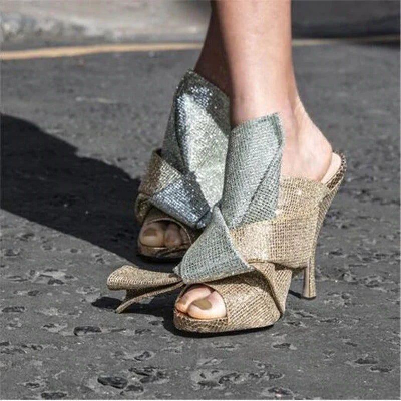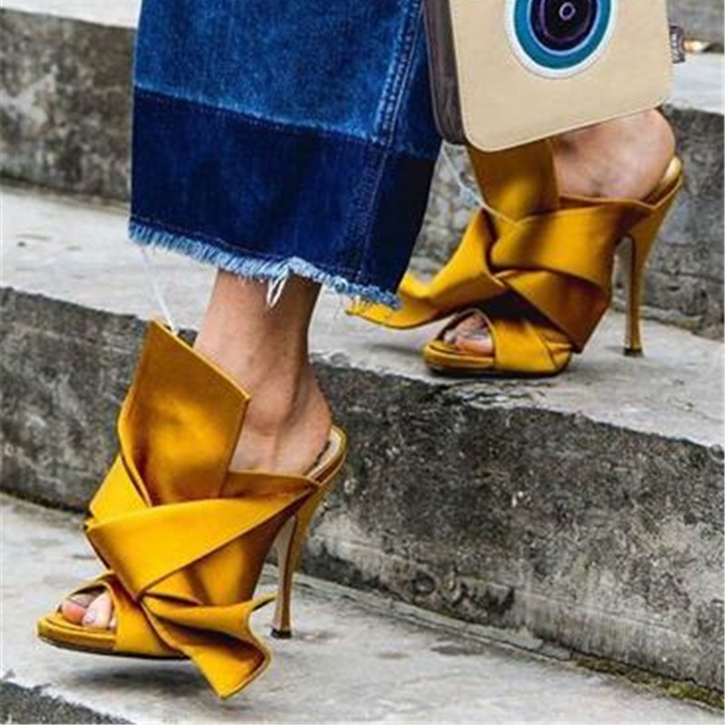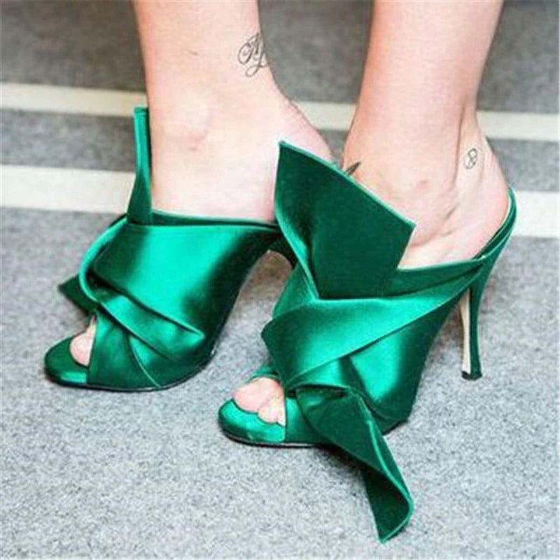 Niulatu Bowtie High Heel Sandals Peep Toe Butterfly-Knot Ruffles High Heels Mules Slip-on Wedding Dress Shoes Big Size 42 DJSE