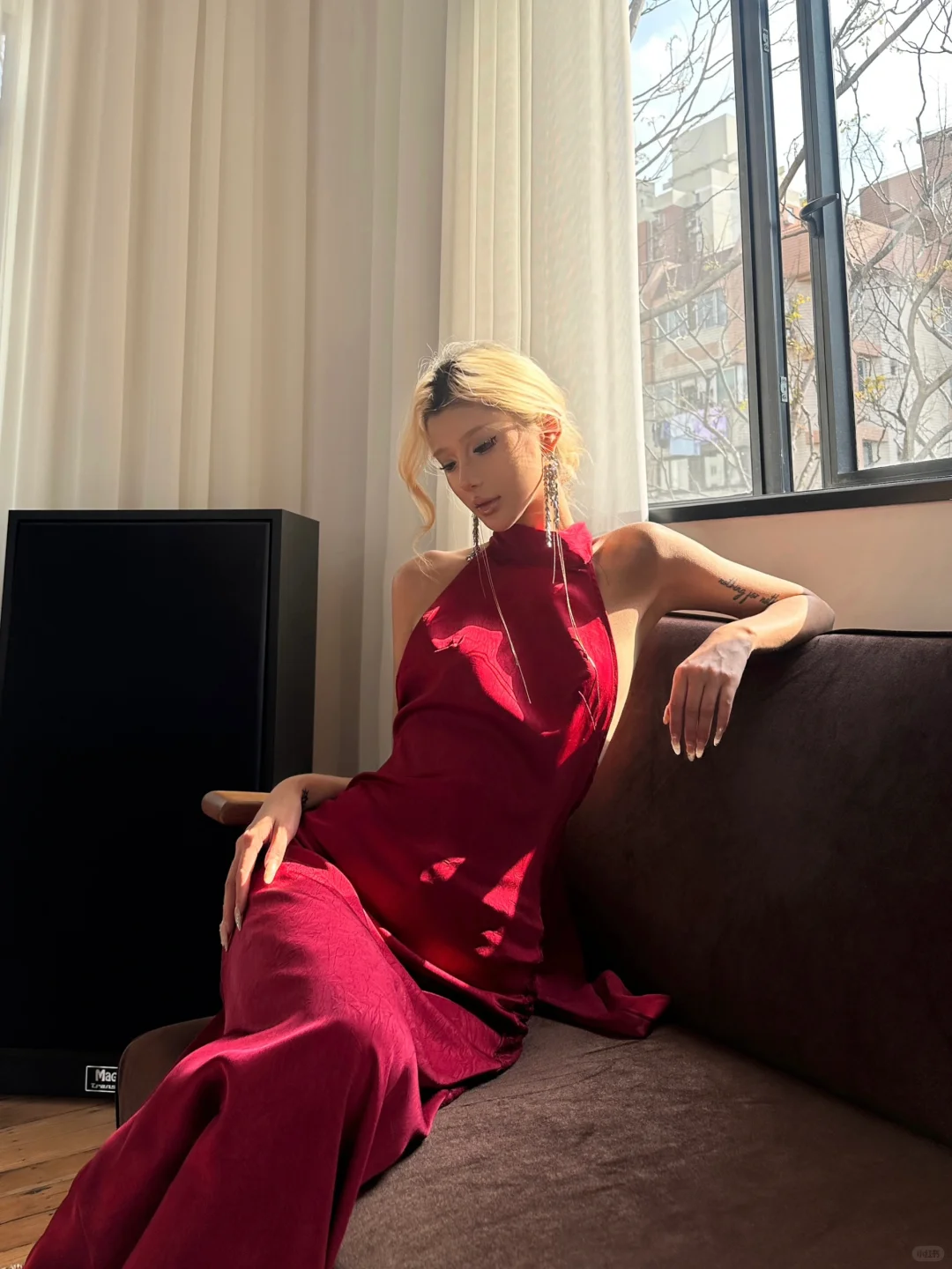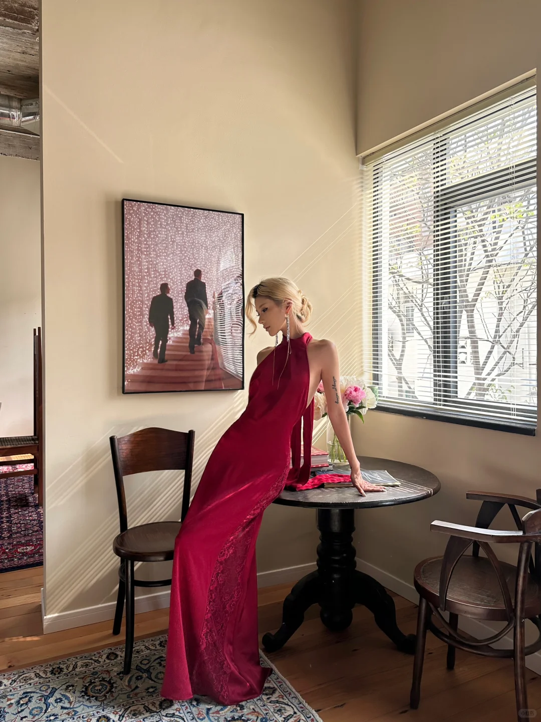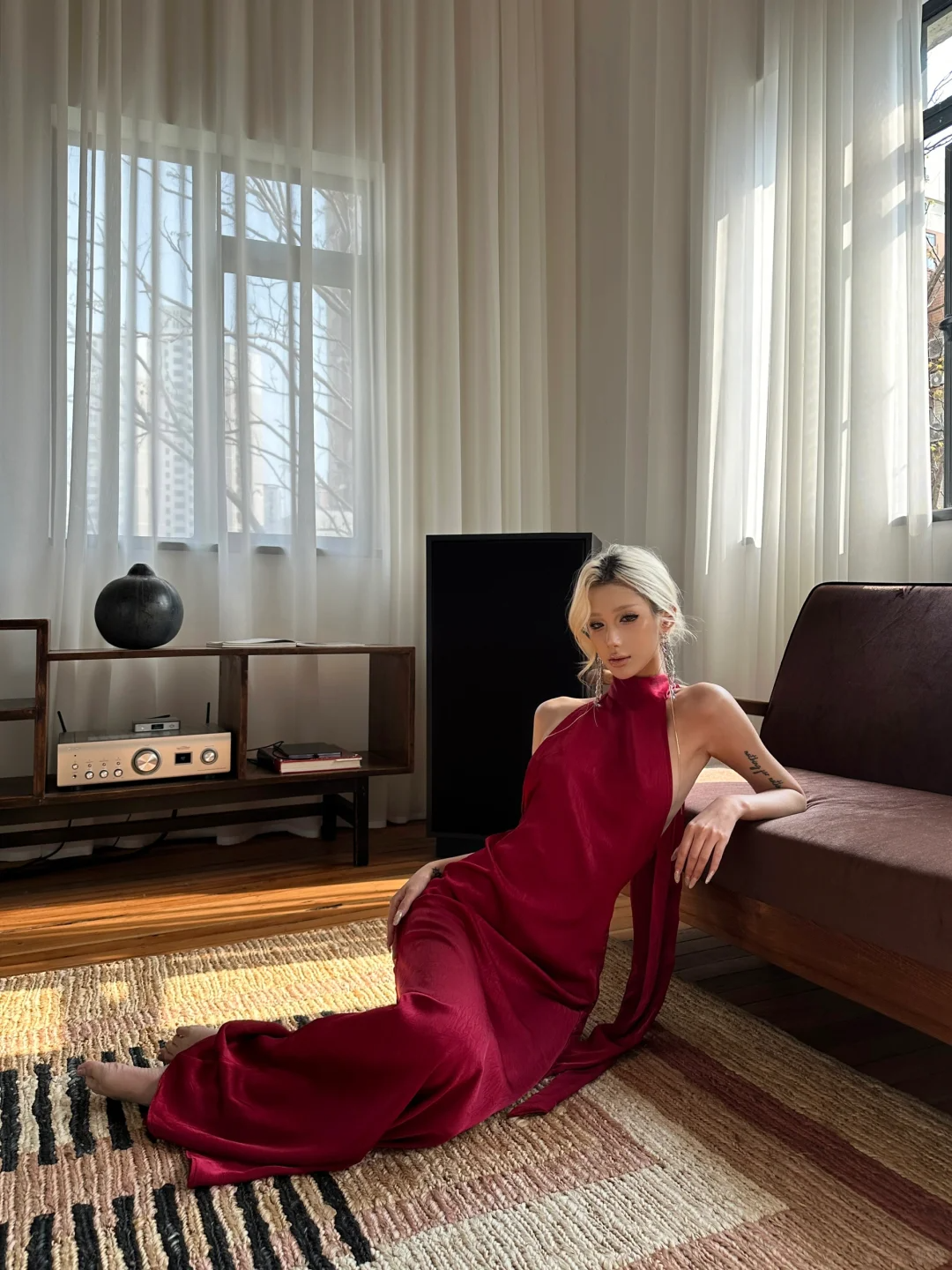 Niulatu Burgundy A Line Halter Lace Satin Open Back Prom Dress Wedding Guest Dress HZ0113