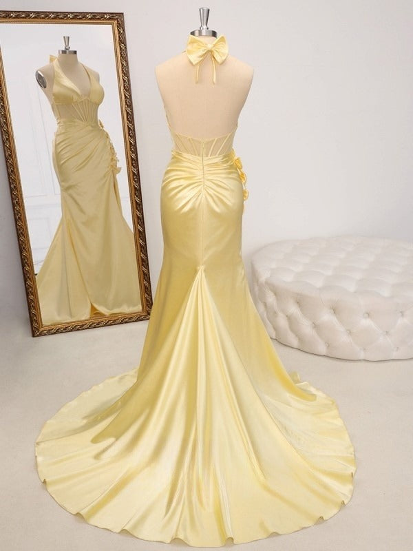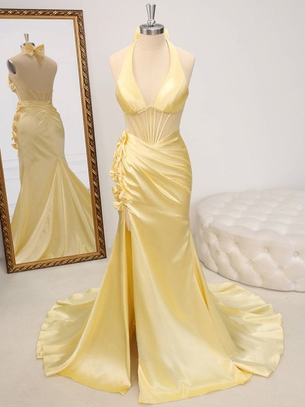 Niulatu Butter Yellow V-Neck Satin Mermaid Prom Dresses Formal Evening Dresses HZ1103