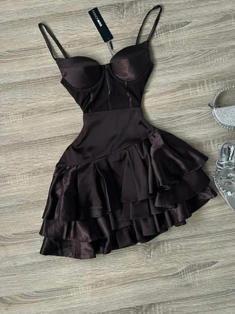 Niulatu Dark Brown Spaghetti Strap Short Party Dress Satin A-Line 16th Birthday Outfit Middle School Hoco Dresses HZ1031