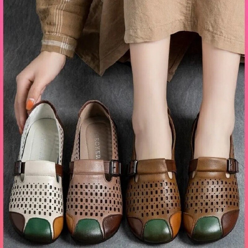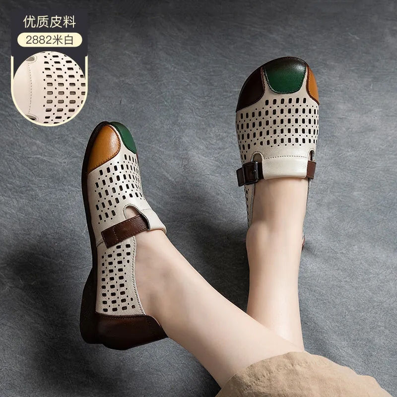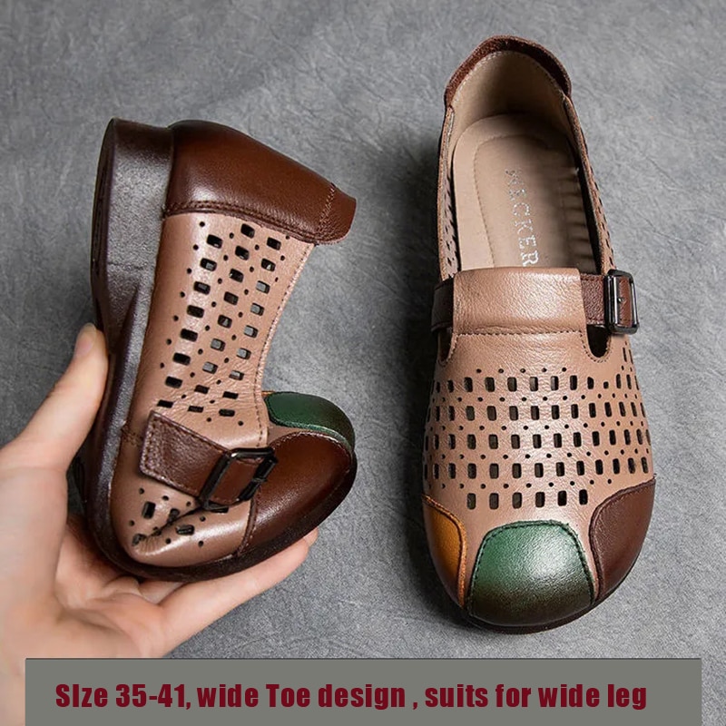 Niulatu Genuine Leather Moccasins Female Casual Wide Toe Comfortable Mary Jane Shoes Summer Cutout Loafers Ladies Wide Shoes DJSE