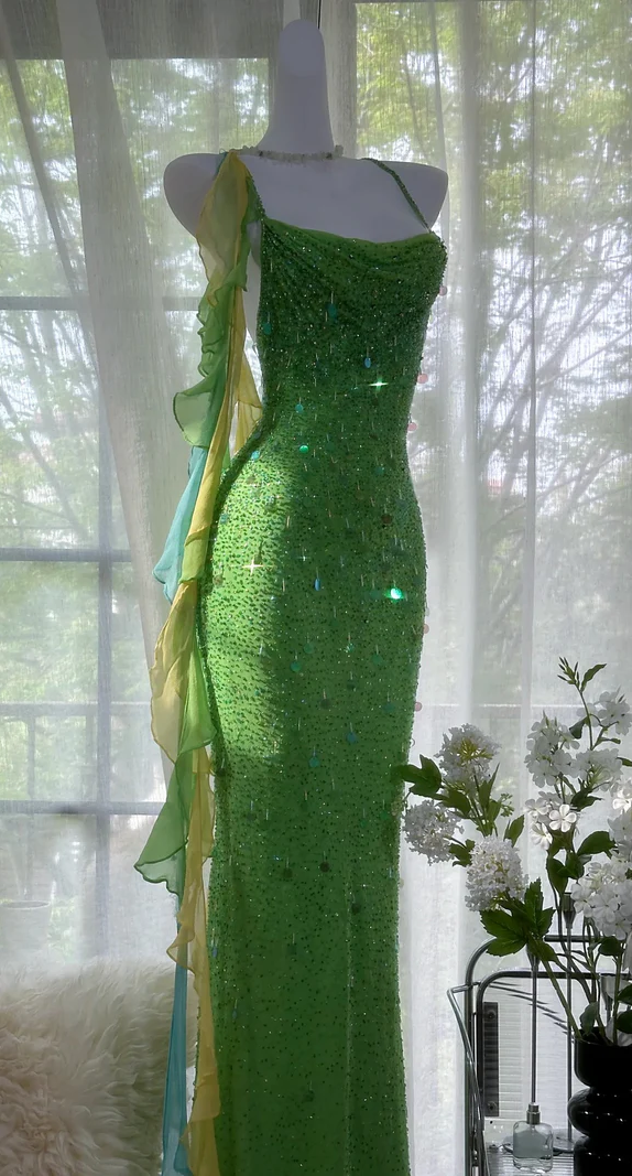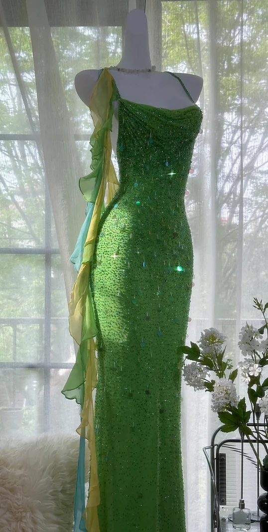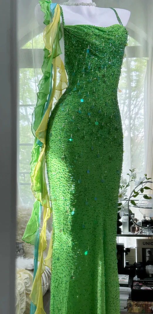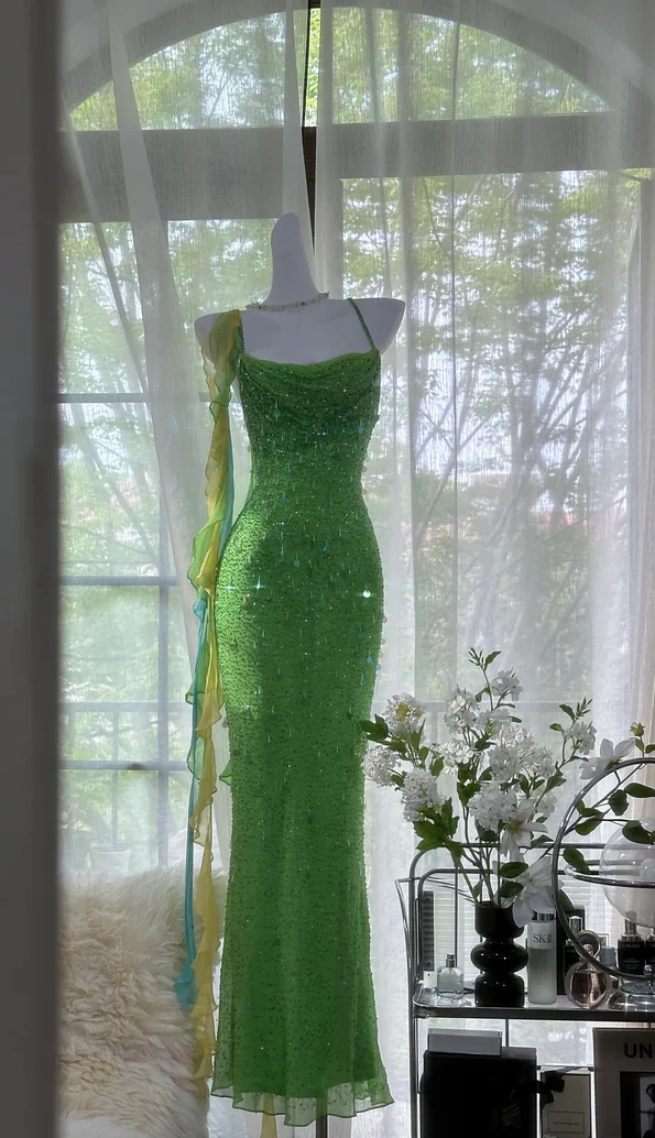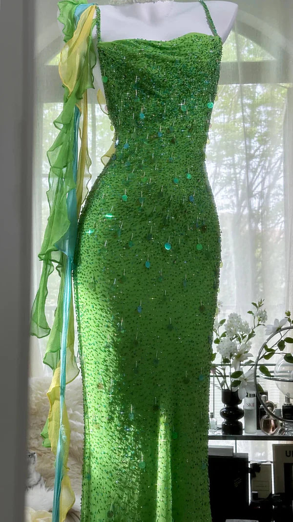 Niulatu Green Spaghetti Strap Mermaid Prom Dresses Sparkling Beaded Sequins Long Evening Dresses with Open Back HZ1103