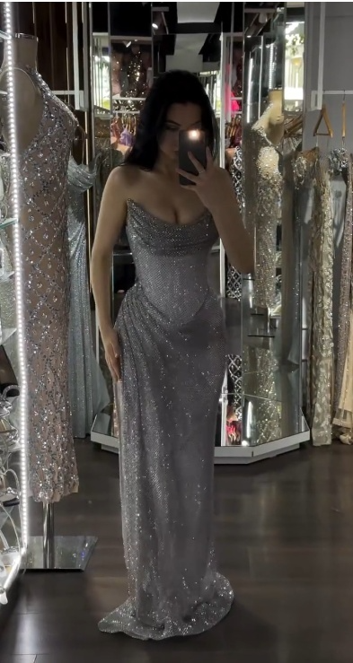 Niulatu Grey Sheath Evening Gowns Strapless Tulle Long Prom Dresses Sparkly Graduation Dress HZ1031
