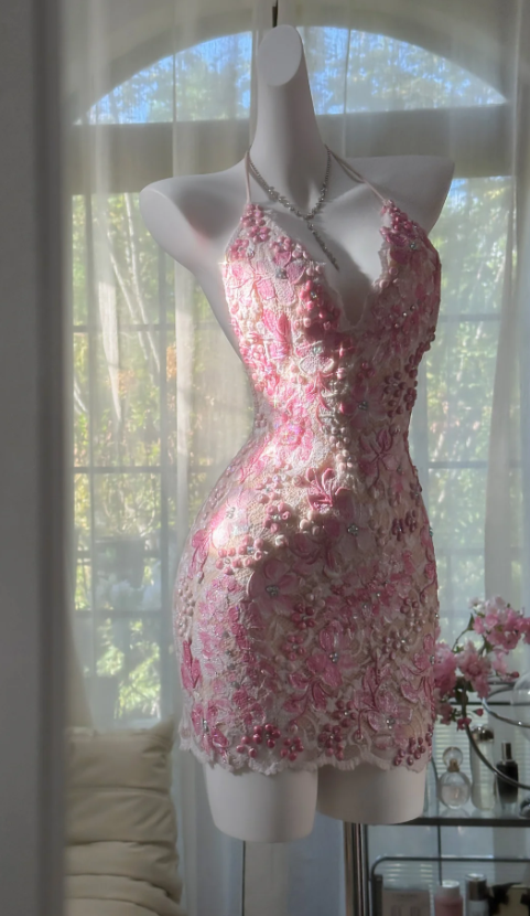 Niulatu Halter Sheath Short Prom Dresses Embroidered Applique Homecoming Dresses Pink Birthday Dresses HZ1026
