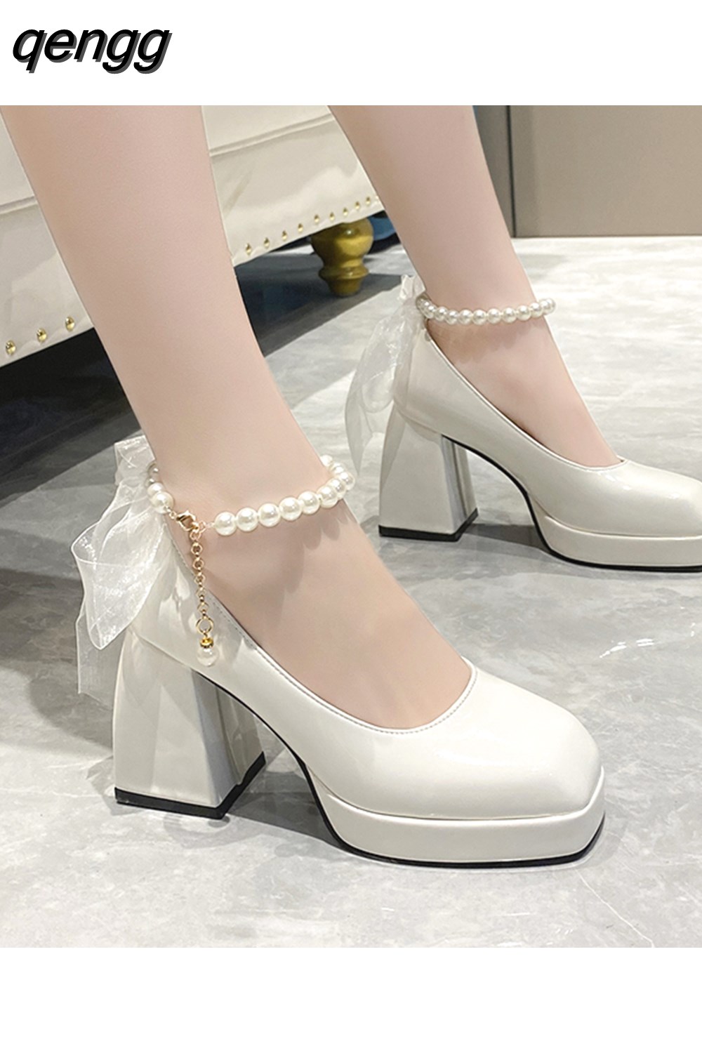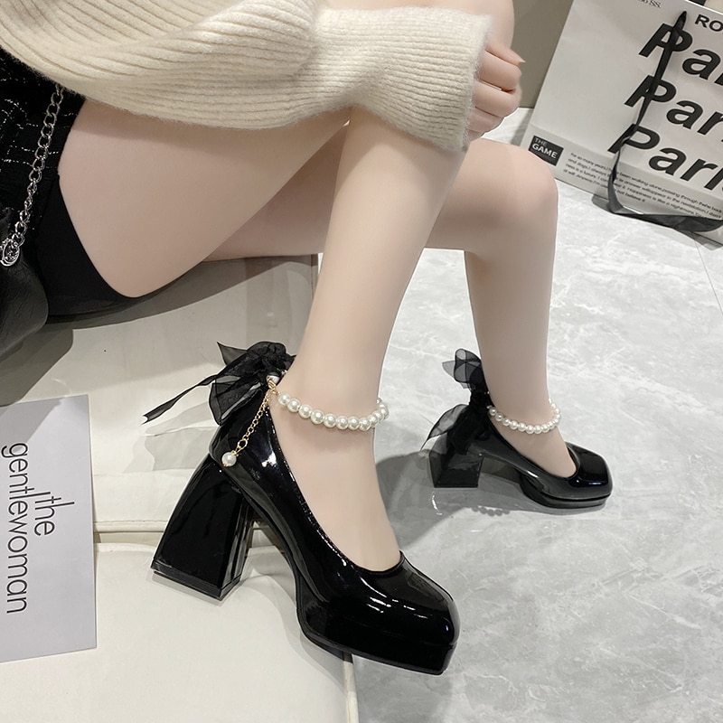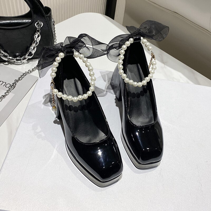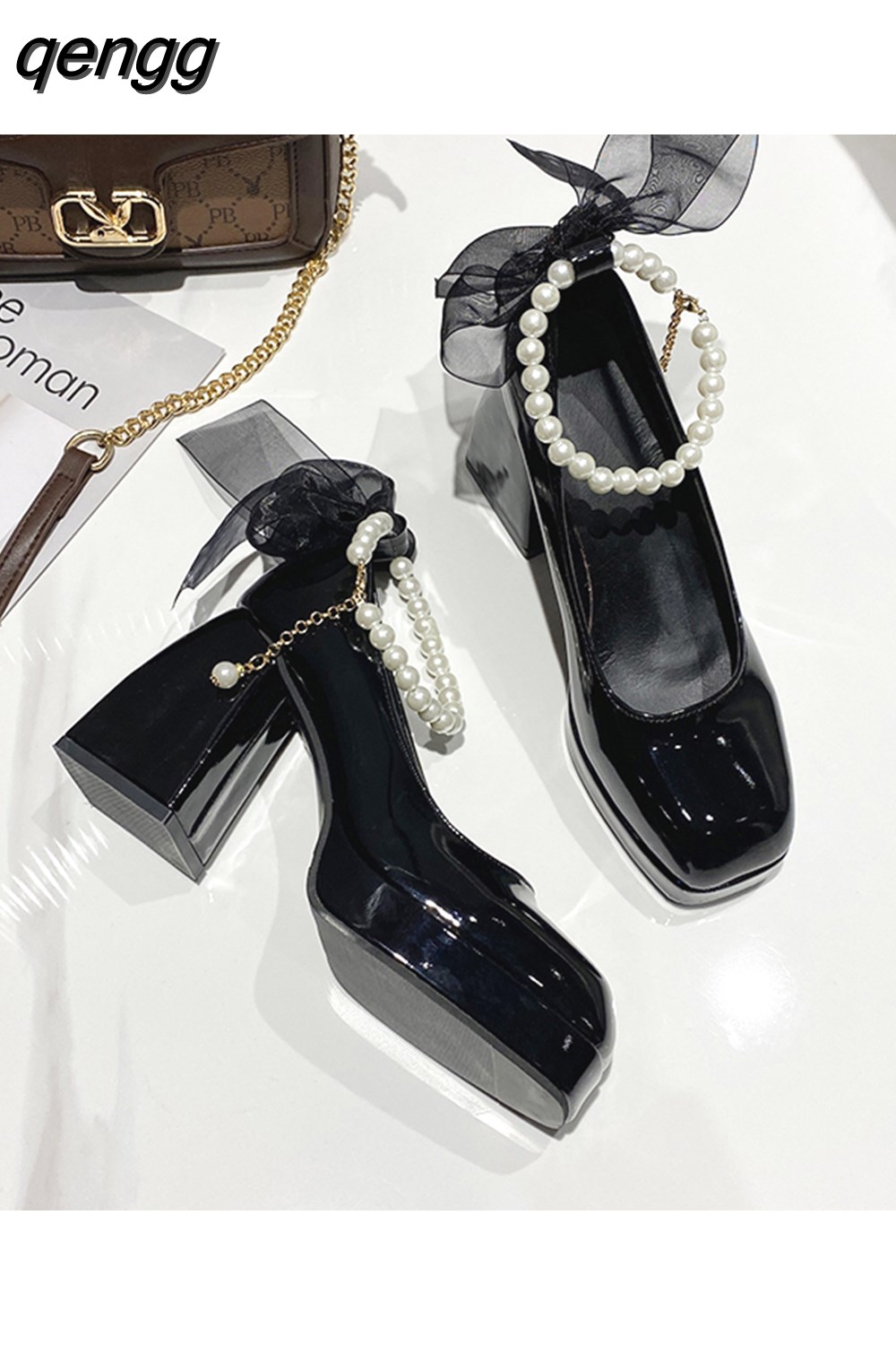 Niulatu Heels Elegant Bow Square Toe Black Fashion Women's Pumps Thick Heel Wedding Party Pearl Lace Wedding Shoes for Women DJSE