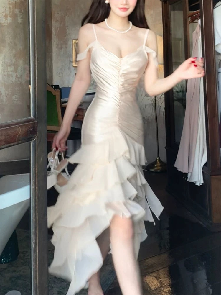Niulatu High Low Spaghetti Straps Chiffon Prom Dresses Evening Dress With Ruffles HZ1110