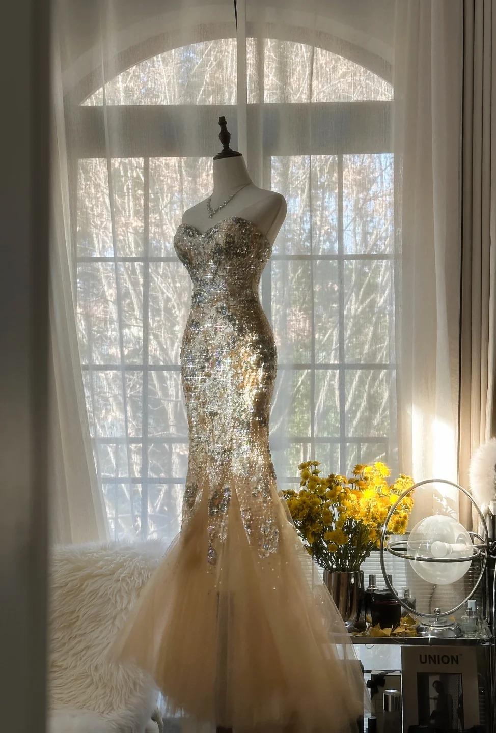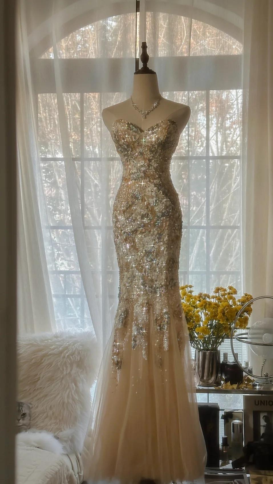 Niulatu Light Champagne Sweetheart Neck Tulle Sequin Mermaid Long Prom Dresses Elegant Party Dress HZ1103