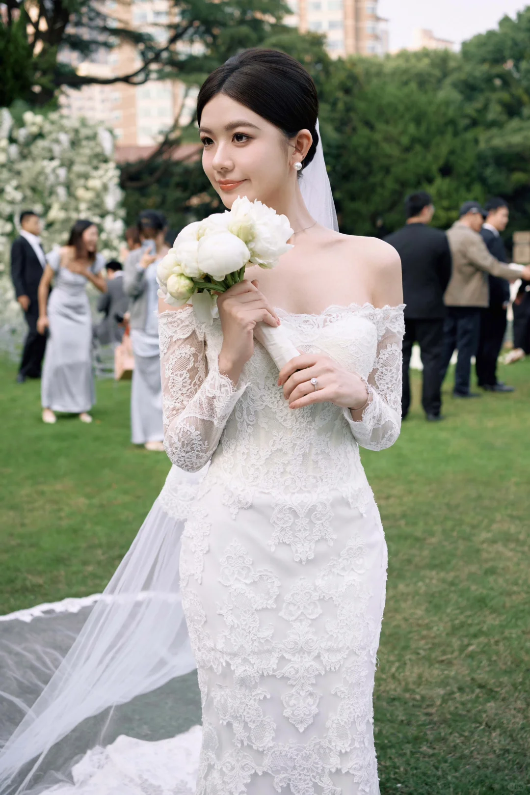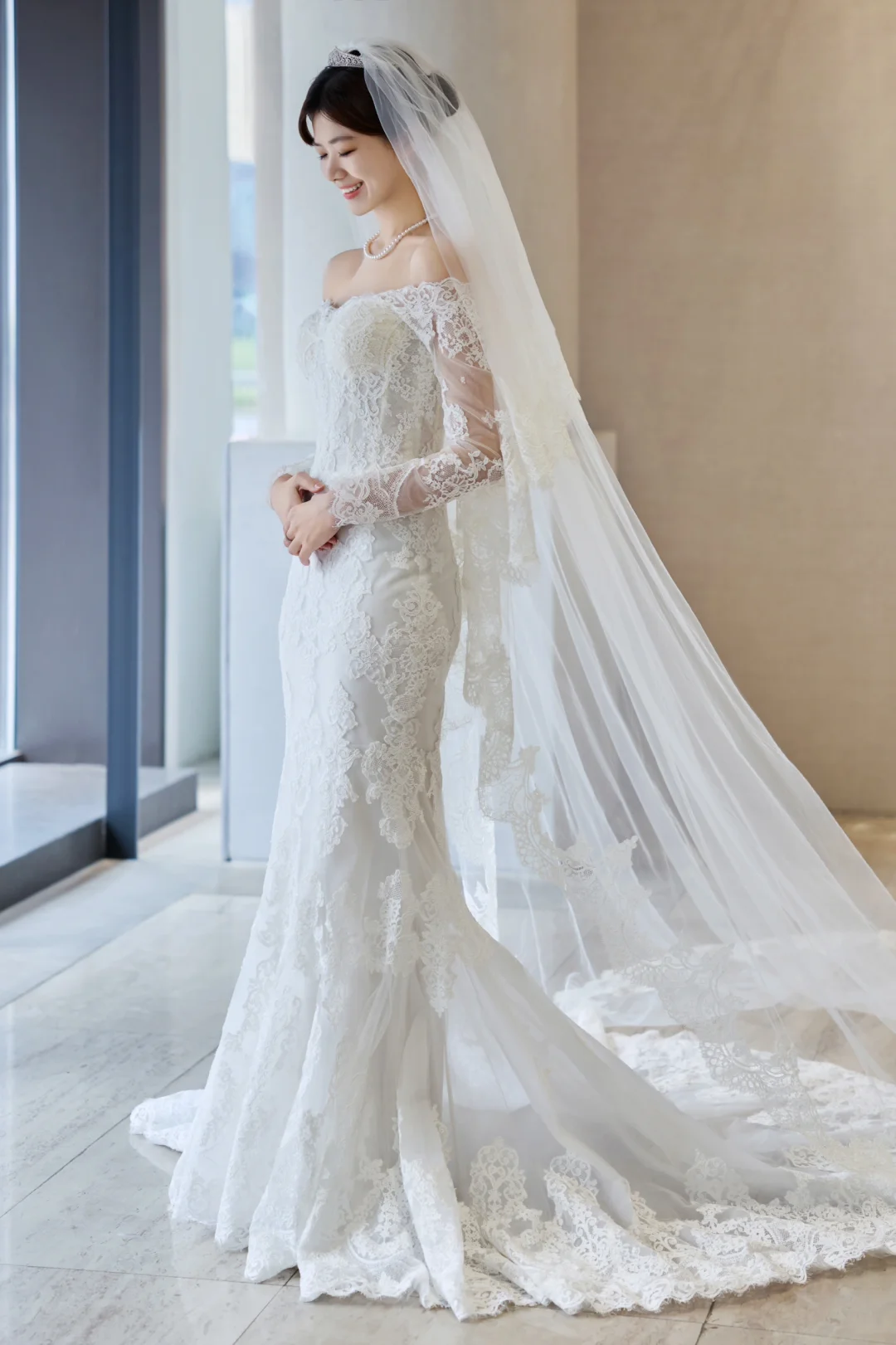 Niulatu Mermaid Off The Shoulder White Tulle Lace Long Sleeves With Veil Long Wedding Dresses HZ1110