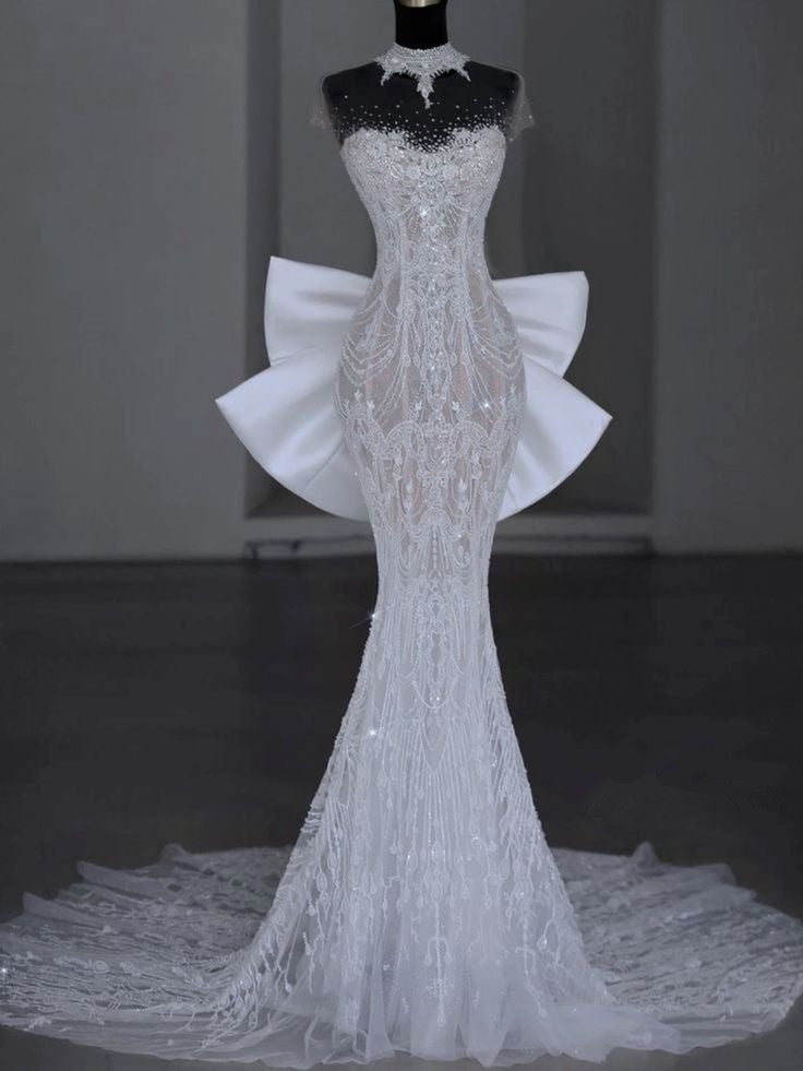 Niulatu Mermaid Scoop Neckline Cap Sleeves Tulle White Long Wedding Dresses With Bow HZ1110