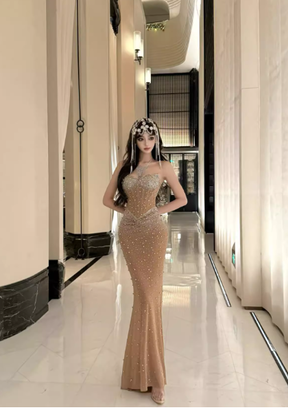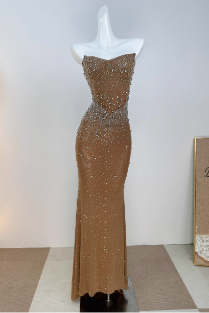 Niulatu Mermaid Strapless Long Prom Dress Beaded Chiffon Champagne Evening Gown HZ1031
