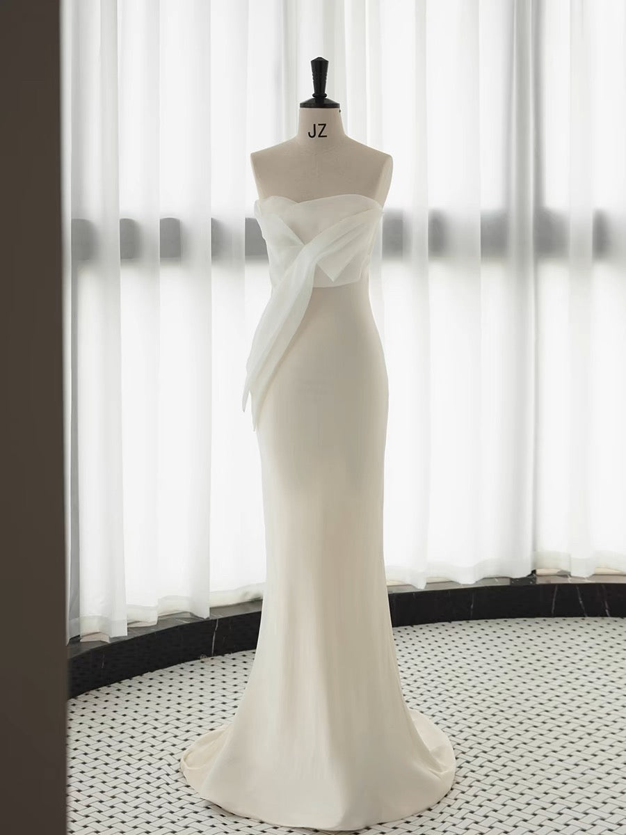 Niulatu Mermaid Strapless Sleeveless White Satin Wedding Dresses With Ruffles HZ1110