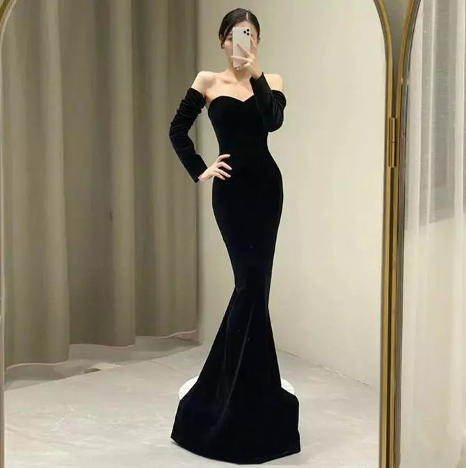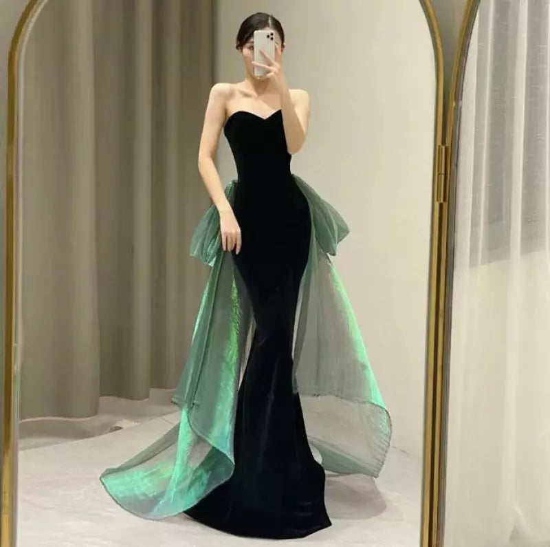 Niulatu Mermaid Sweetheart Black Velvet Long Evening Dress Prom Dresses With Bow HZ1110