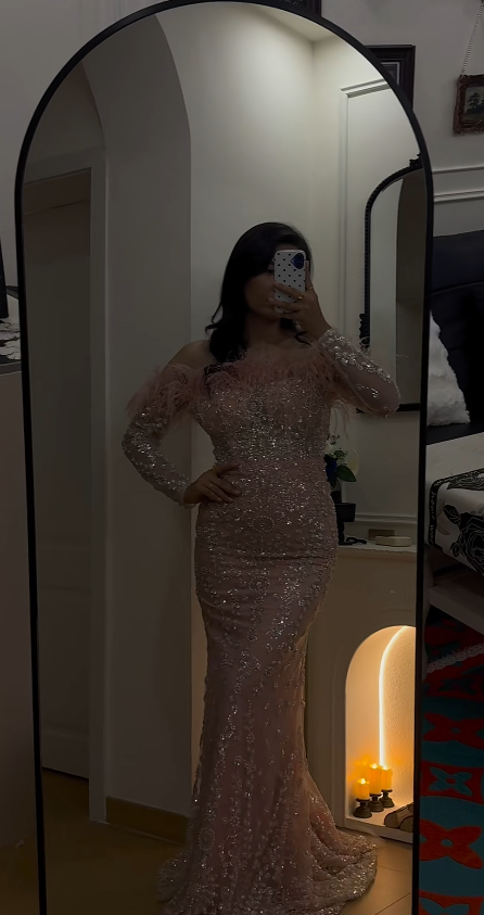 Niulatu Off-the-shoulder Mermaid Long Prom Dresses Tulle Applique Pink Long Formal Dresses Long Sleeve Evening Gowns HZ1026