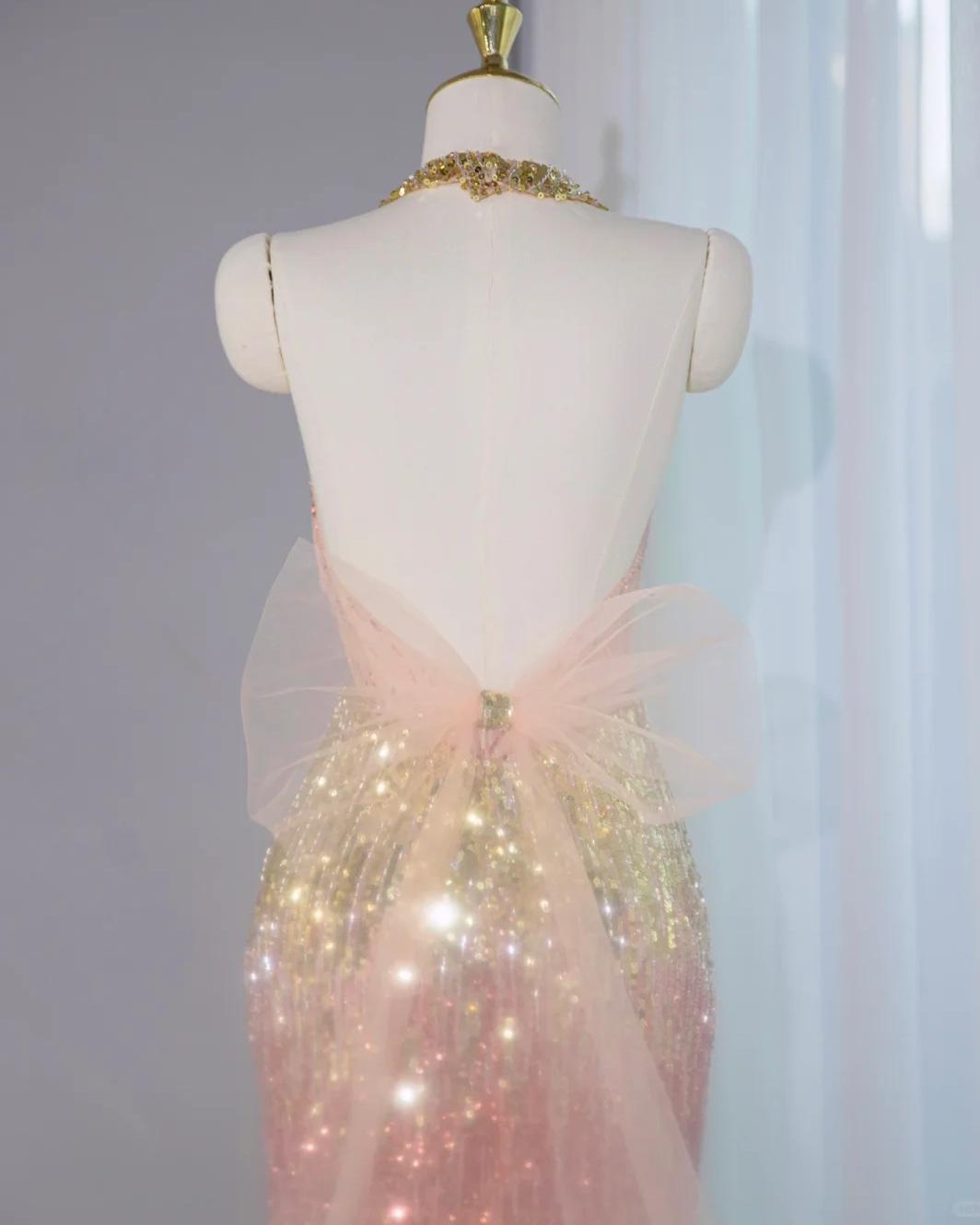 Niulatu Ombre Peach Tulle V-Neck Mermaid Gold Sequins Long Prom Dresses Glam Formal Evening Dress HZ1103