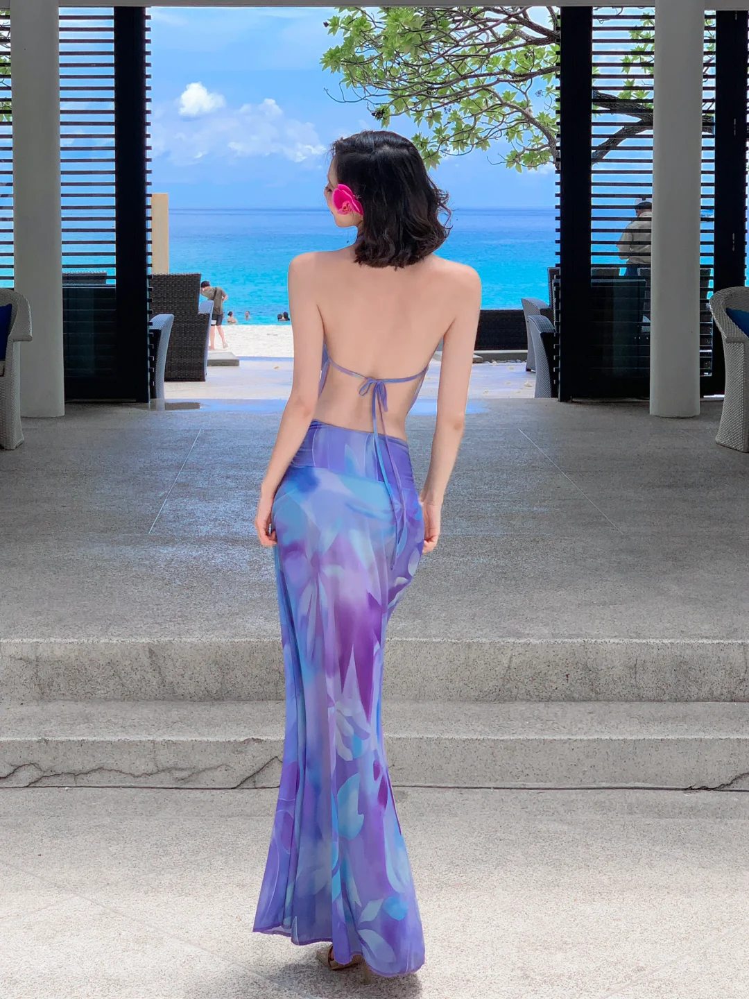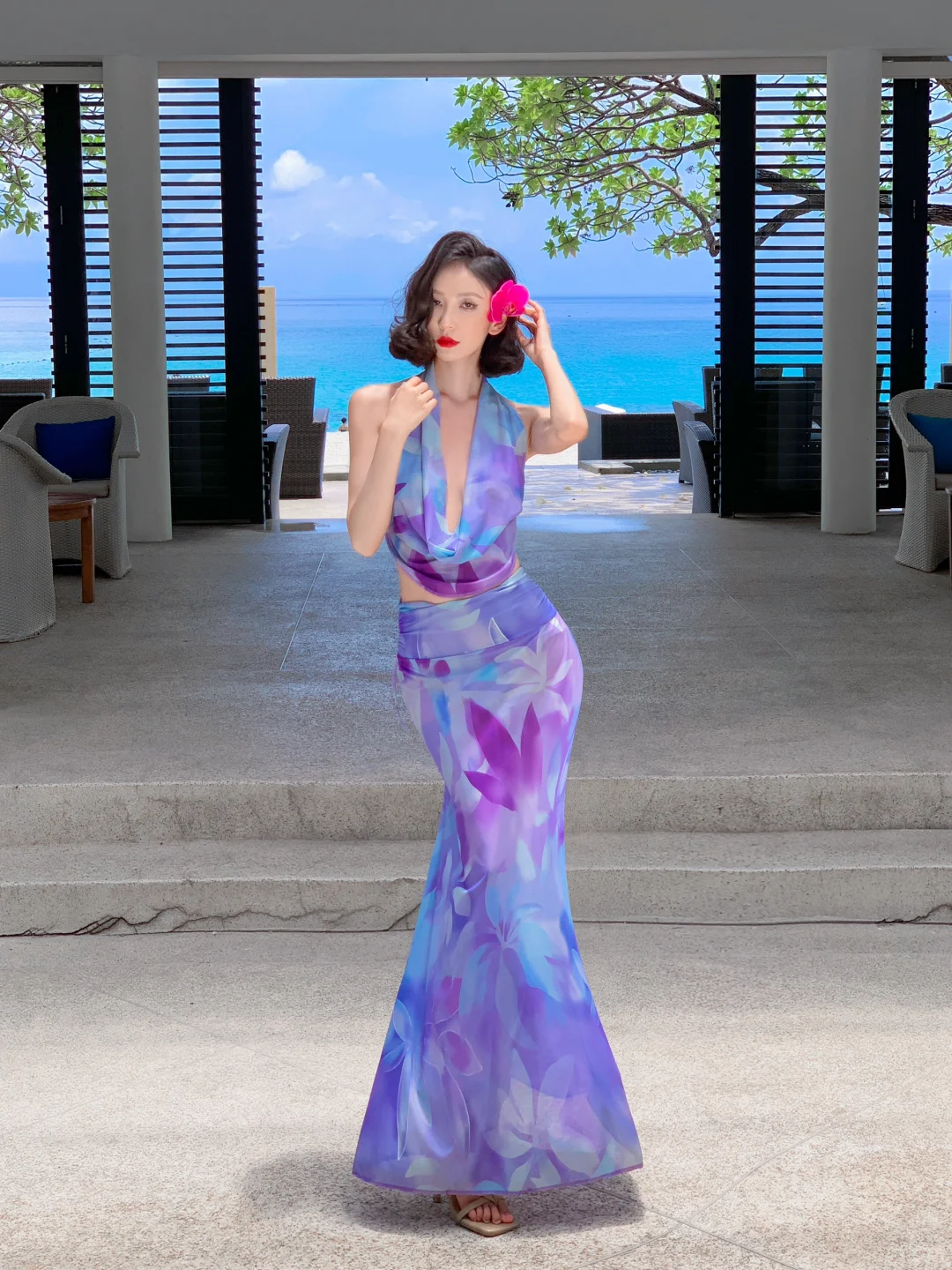 Niulatu Piece Mermaid Halter Purple Print Floral Chiffon Long Prom Dress Outfits HZ0113