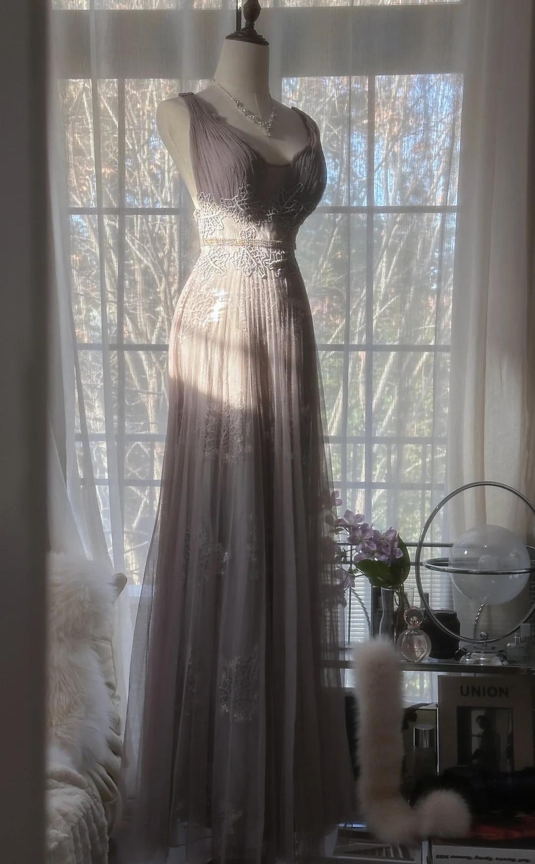 Niulatu Purple A-Line V Neck Tulle Lace Long Prom Dress Gorgeous Evening Dress HZ1103