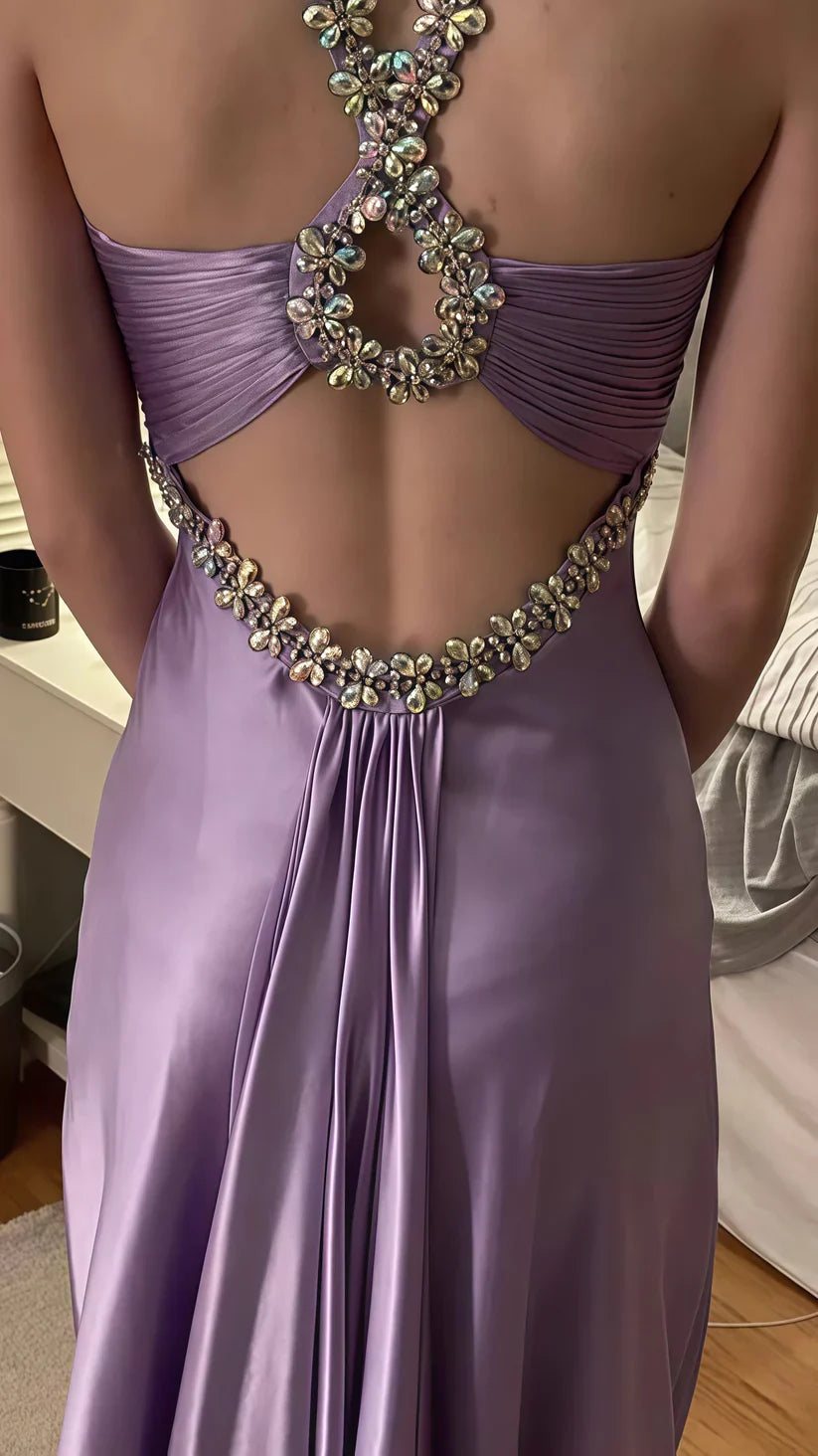 Gentle Purple ??Satin Beaded Backless Long Prom Dress for Pool Party&Birthday Sexy Evening Dresses