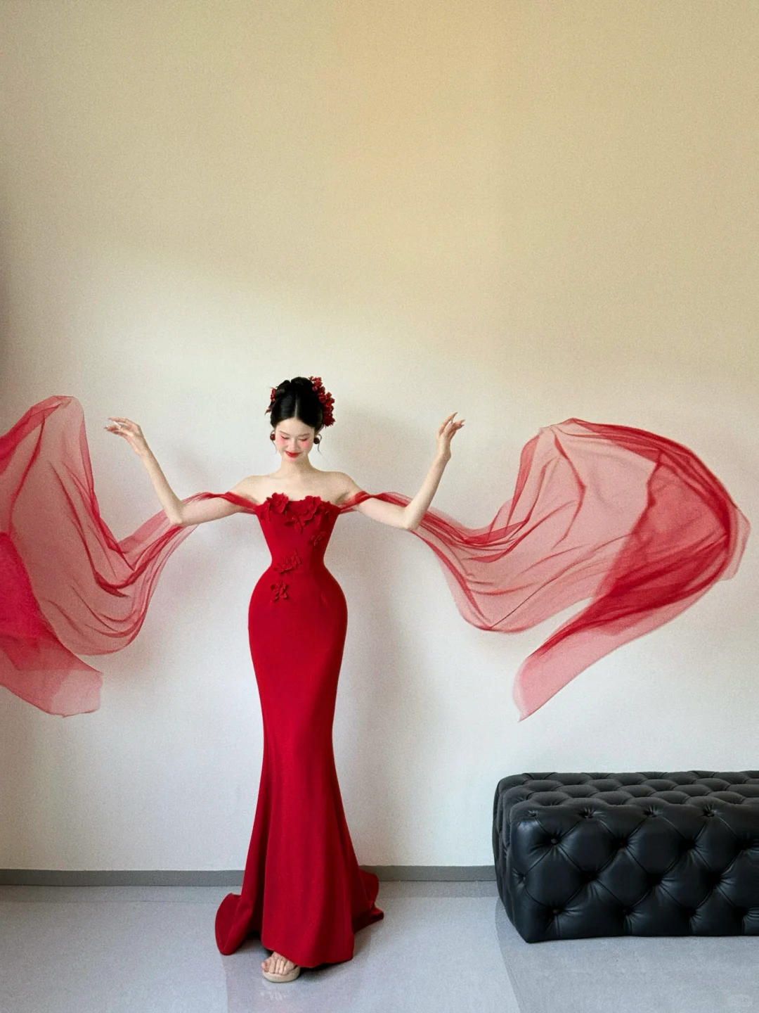 Niulatu Red Mermaid Off The Shoulder Satin Tulle Applique Long Prom Dresses HZ1110