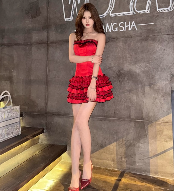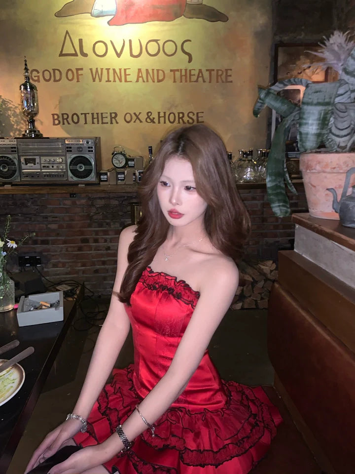 Niulatu Red Strapless Sheath Layered Satin Short Prom Dresses Outdoor Party Outfit HZ1031
