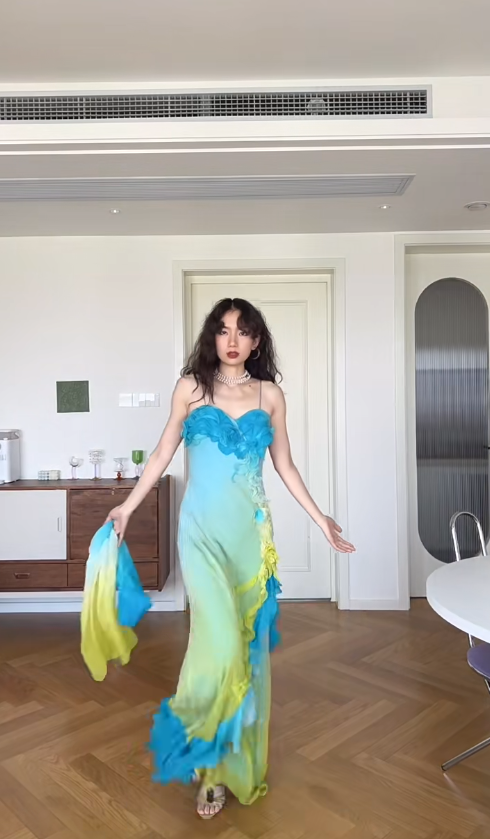 Niulatu Sheath Spaghetti Strap Ruffle Yellow Blue Ombre Chiffon Prom Dress Wedding Guest Dress HZ0113