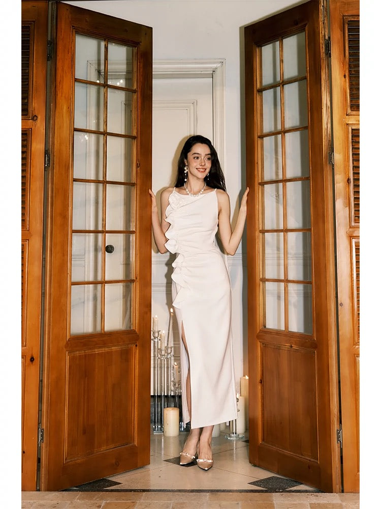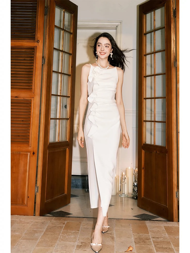 Niulatu Sheath Spaghetti Straps White Ruffles Long Prom Dresses HZ1110