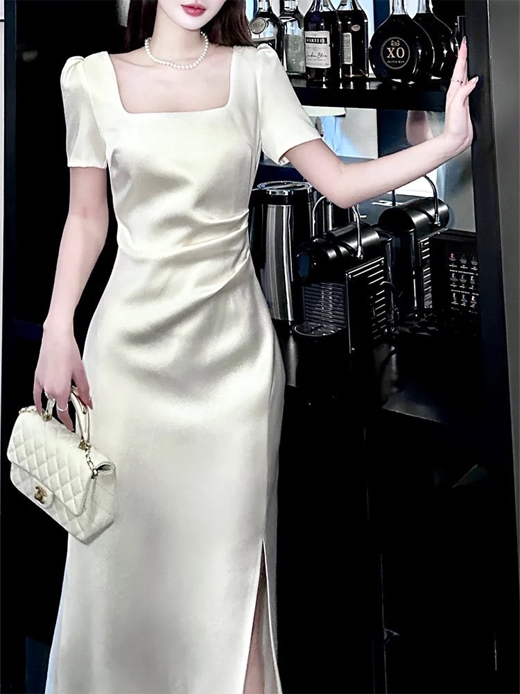 Niulatu Sheath Square Neckline Short Sleeves Slit Ivory Long Prom Dresses HZ1110