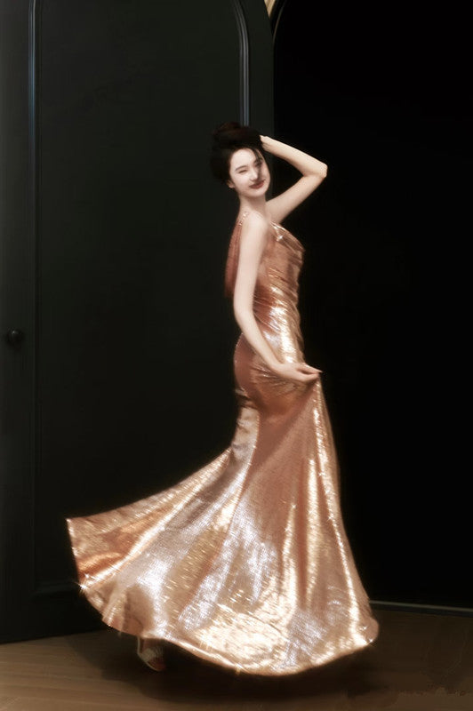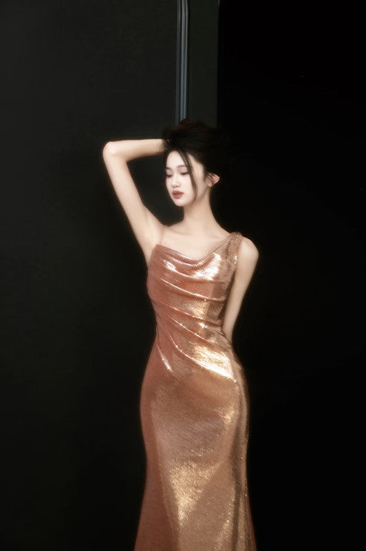 Niulatu Sheath Straps Sequin Gold Prom Dresses Party Evening Dress With Ruffles HZ1110