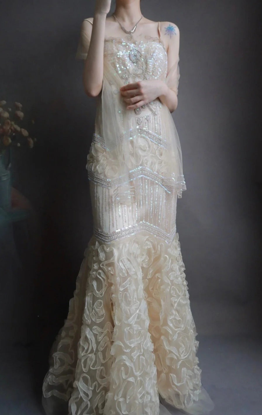 Niulatu Spaghetti Strap Mermaid Long Prom Dresses Beaded Tulle Sequin Evening Dresses HZ1026