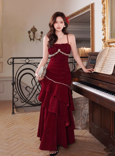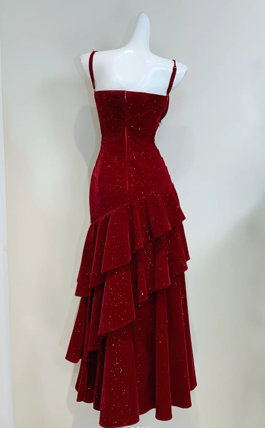 Niulatu Spaghetti Strap Sheath Burgundy Long Prom Dresses Burgundy Birthday Dresses Ruffle Velvet Sleeveless New Year's Evening Dress HZ1026