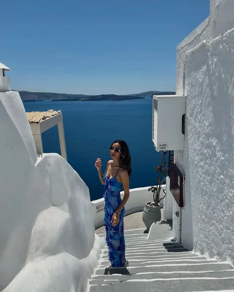 Niulatu Spaghetti Straps Blue Chiffon Print Floral Ruffles Prom Dress Long Evening Dress HZ1007