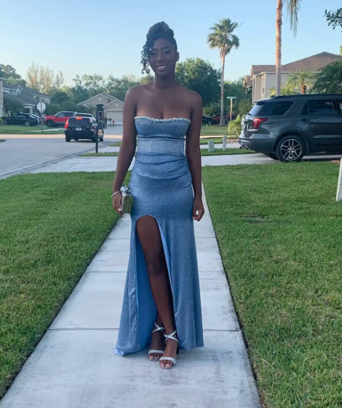 Niulatu Strapless Sheath Blue Long Prom Dresses Glitter Chiffon Blue Evening Dresses with Slit HZ1026