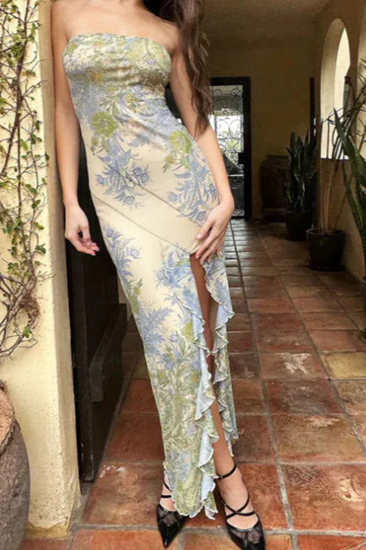 Niulatu Strapless Sheath Print Chiffon Prom Dresses, Slit Formal Evening Dresses HZ1026