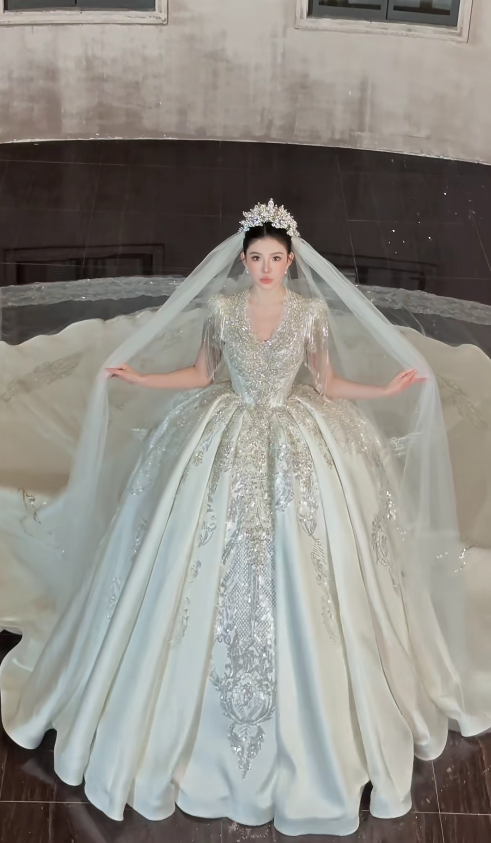 Niulatu V-neck Ball Gown Long Wedding Dresses Short Sleeve Bridal Gowns Beaded Satin Bridal Dresses HZ1026