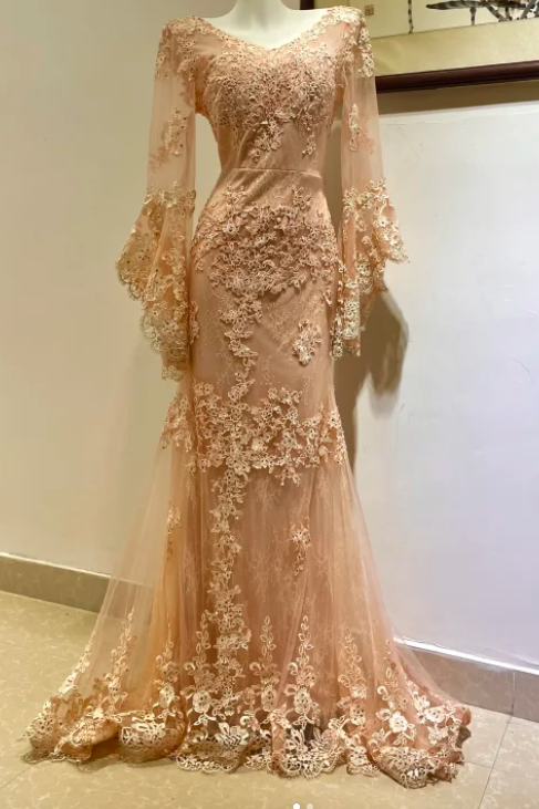 Niulatu V-neck Memaid Long Prom Dresses Long Sleeve Chiffon Applique Champagne Evening Dresses HZ1026