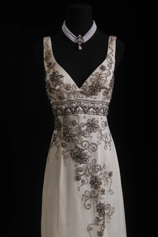 Niulatu V-neck Sheath Beige Long Prom Dresses Beaded Chiffon Open Back Evening Dresses HZ1026