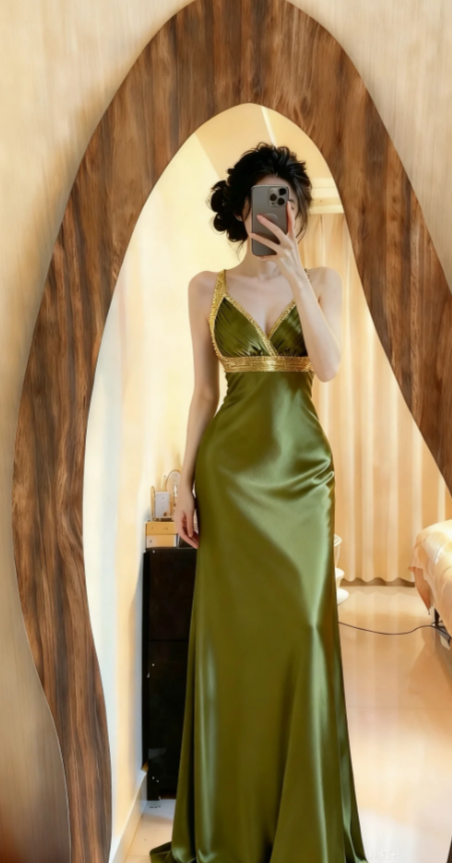 Niulatu V-neck Sheath Green Long Prom Dresses Satin Sleeveless Green Evening Dresses HZ1026