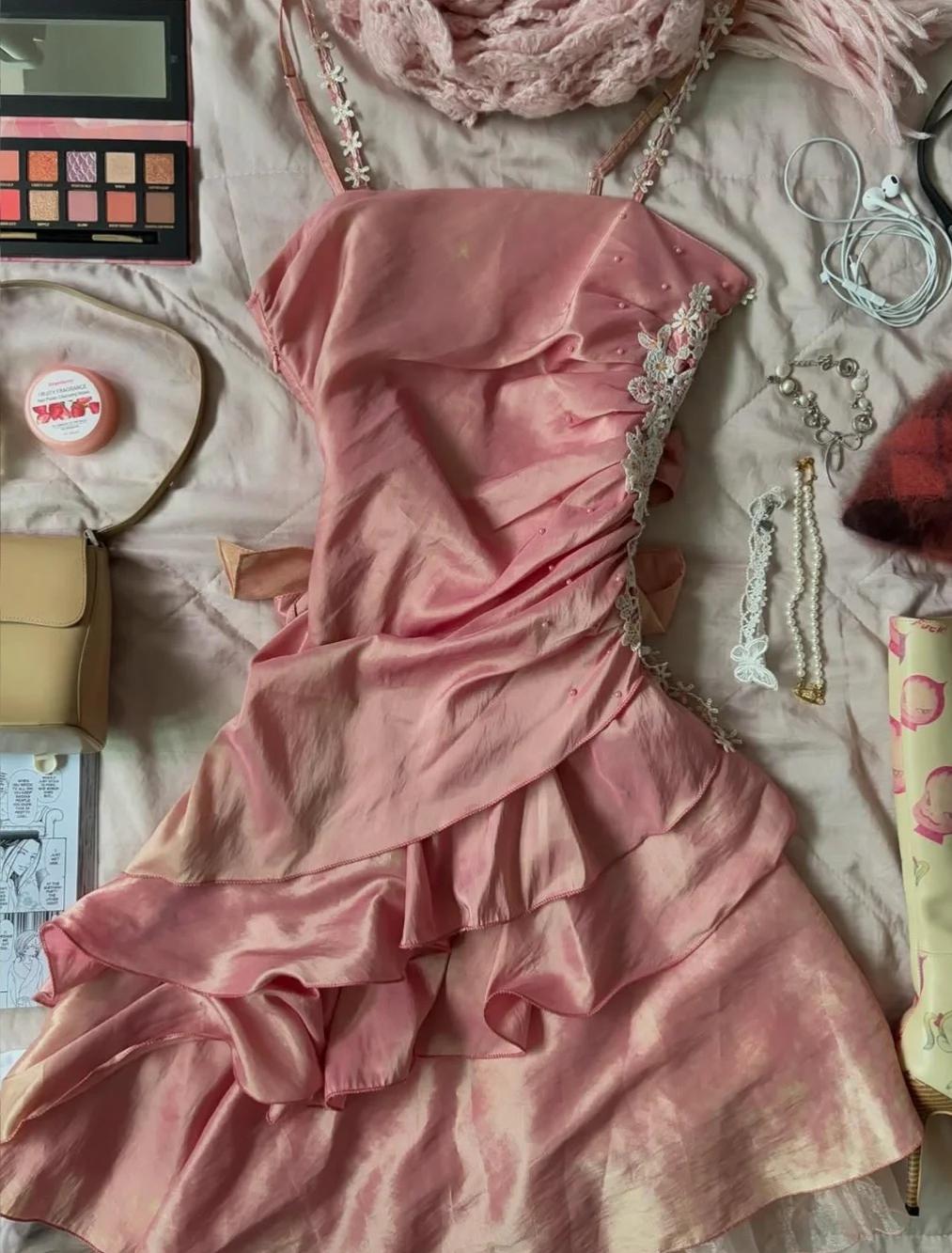 Niulatu Vintage Outfits for Party Y2K Spaghetti Straps Sheath Chiffon Satin Short Prom Dresses HZ1103