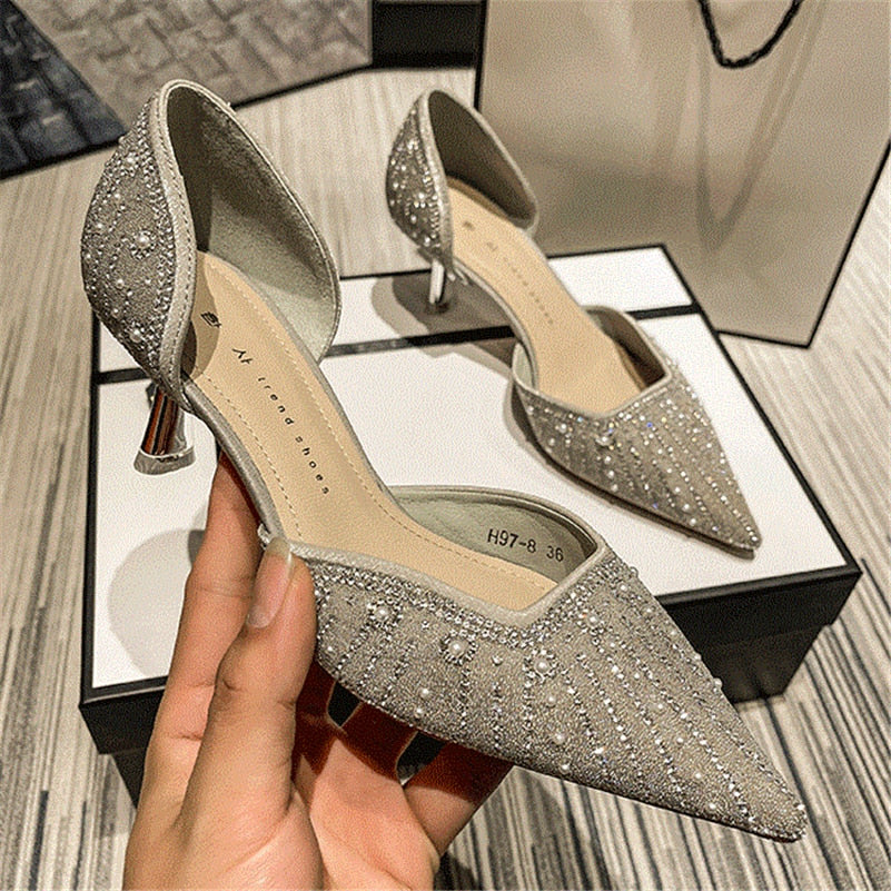 Niulatu Women Two-Piece Shoes Thin High Heels Pointed Toe Pumps Elegant String Bead Crystal Party Ladies Footwear Autumn Apricot DJSE