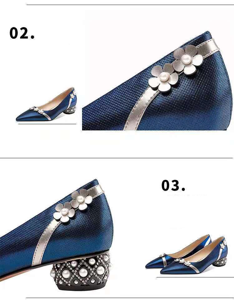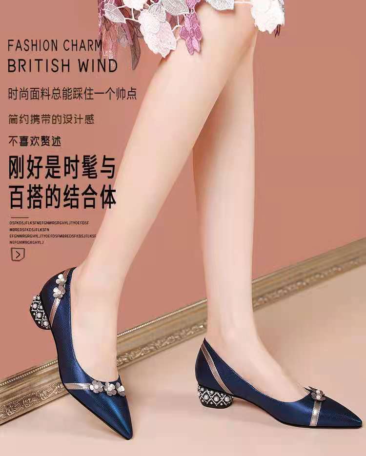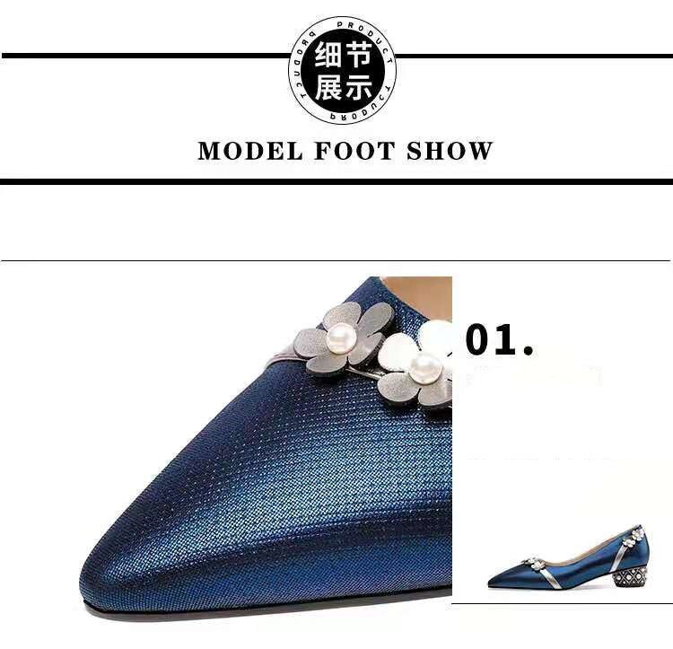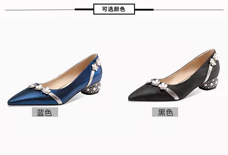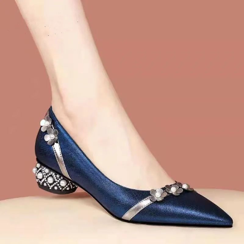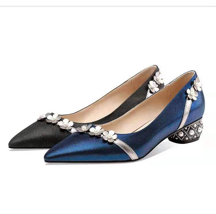 Niulatu Women's Autumn Shallow Leather Shoes All-match Low Heel Crystal Elegant Flower Shoes Soft Ladies's Party Blue Black Work Shoes DJSE