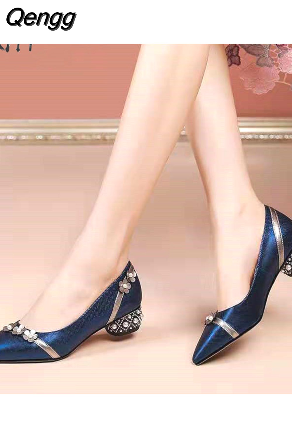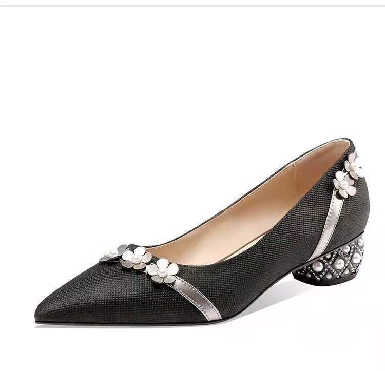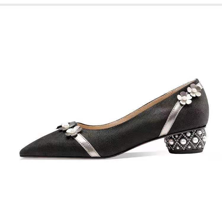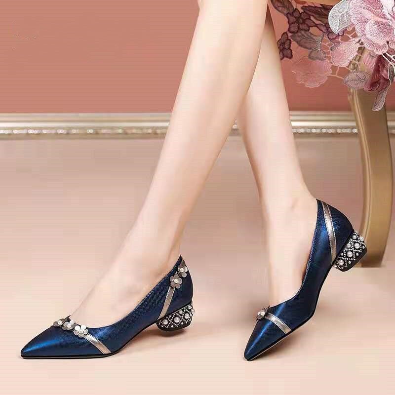 Niulatu Women's Autumn Shallow Leather Shoes All-match Low Heel Crystal Elegant Flower Shoes Soft Ladies's Party Blue Black Work Shoes DJSE