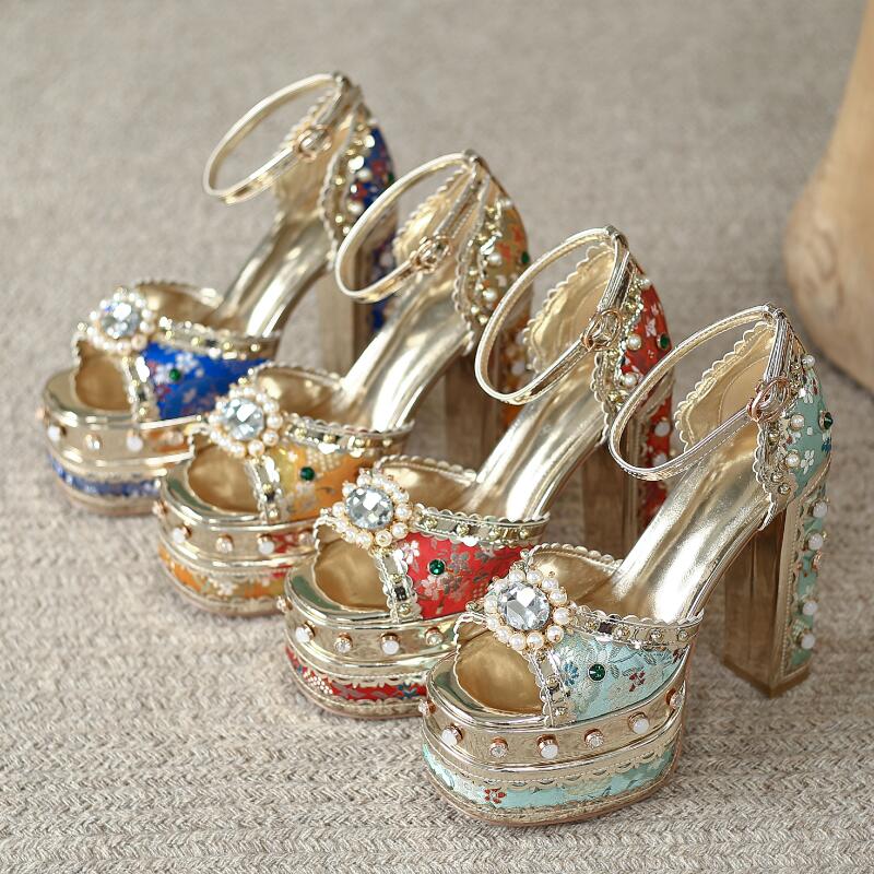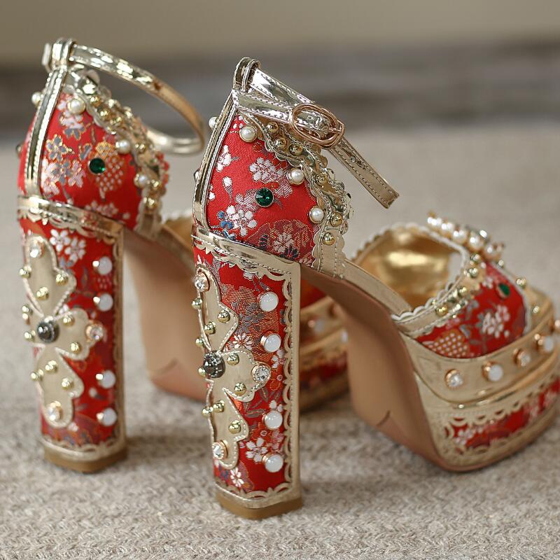 Niulatu Women's Sexy Embroidery Wedding Sandals Thick High Heel Platform Fish Mouth Pumps Gemstone Rivet Party Shoes Red Big Size DJSE