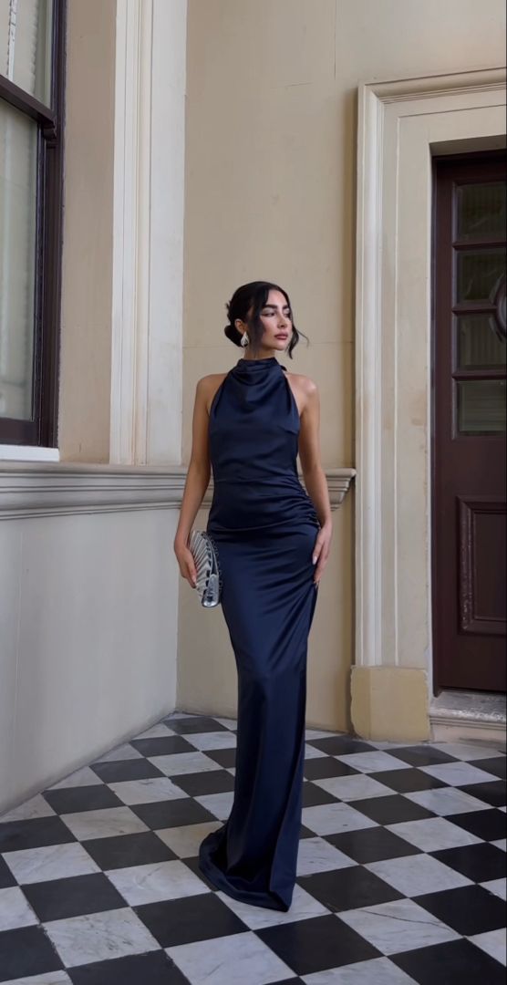 Pretty Mermaid High Neck Navy Blue Evening Party Dresses Formal Summer Wedding Guest Dresses Wedding Guest Outfits HZ1214