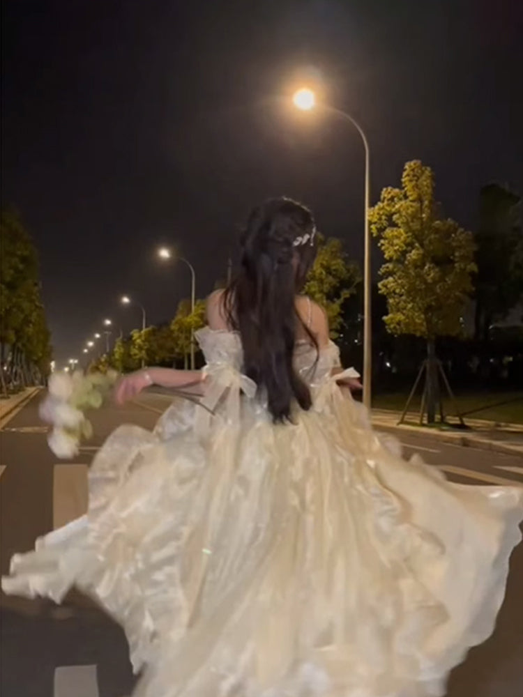 Princess High Low Off The Shoulder Short Sleeves Ivory Floral 16th Chiffon Birthday Dress Lolita Dress 18th Birthday Outfits HZ1214