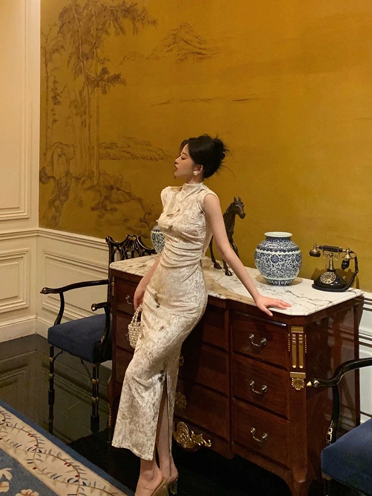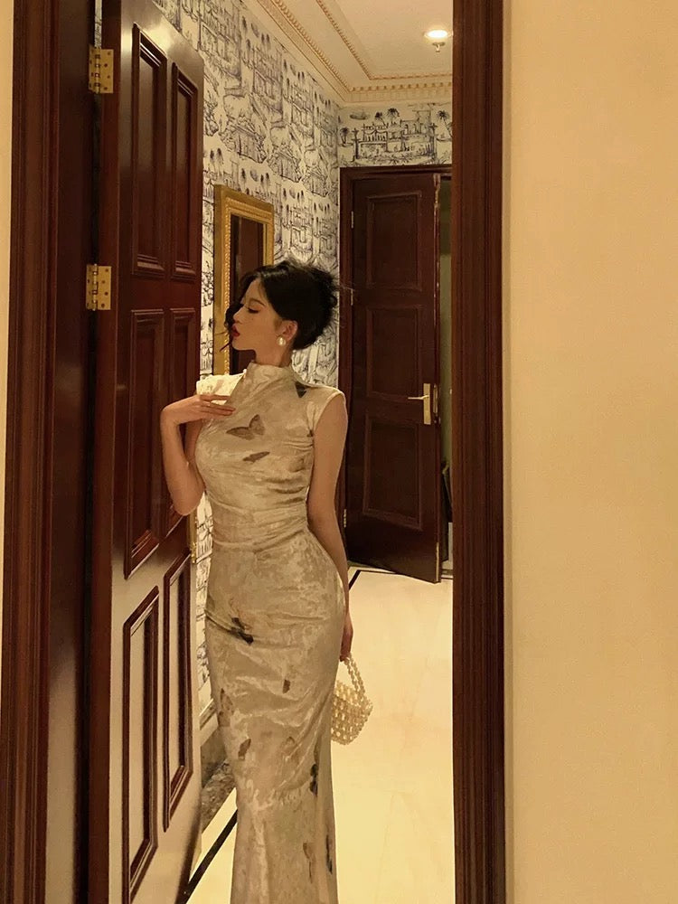 Niulatu Sheath High Neckline Velvet Flora Prom Dresses Birthday Outfits Evening Gown SD1090